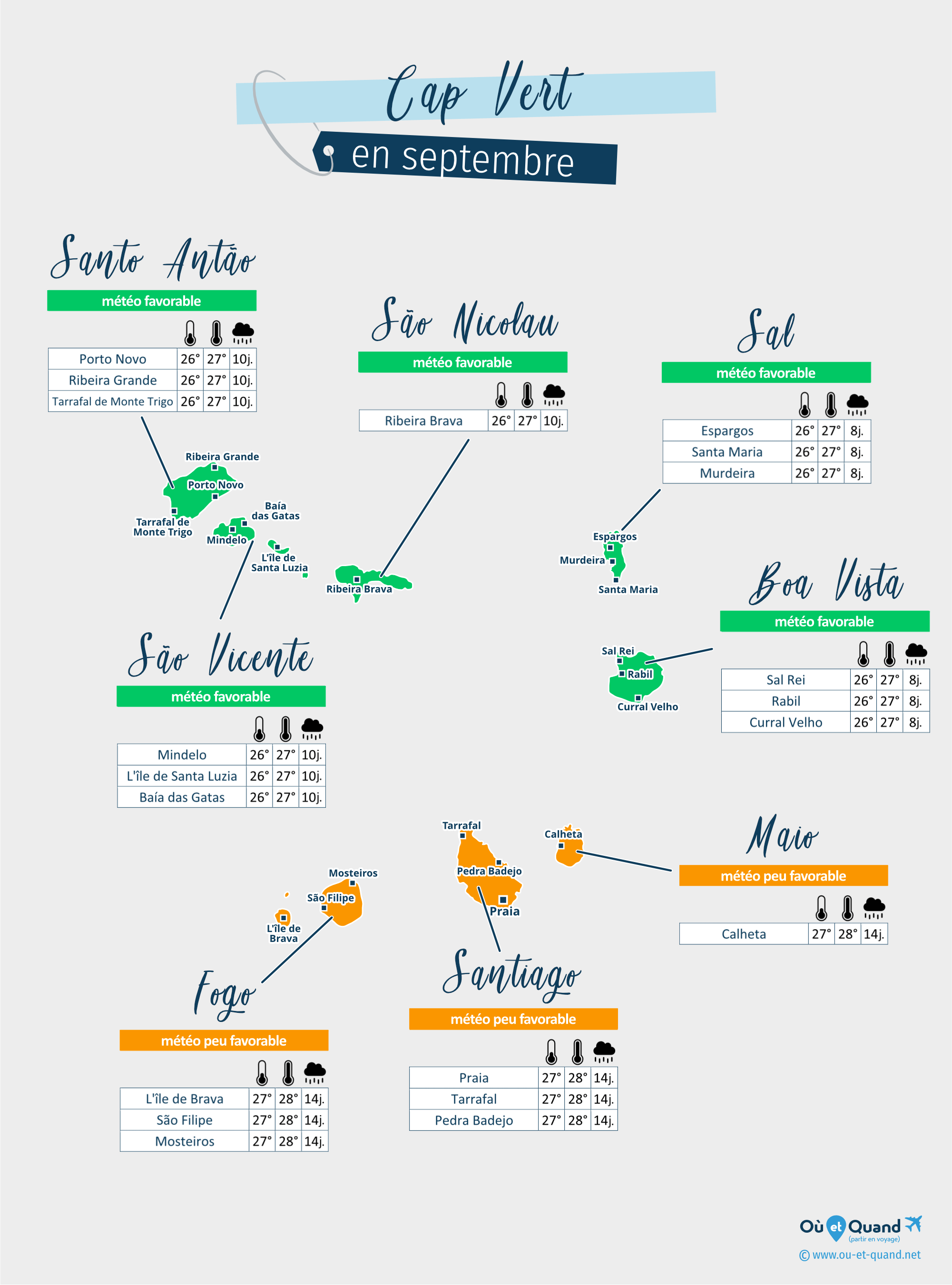 | Santo Antão en septembre (Porto Novo, Ribeira Grande, Tarrafal de Monte Trigo...) | 27°C | 10 jours | 27°C | favorable |
