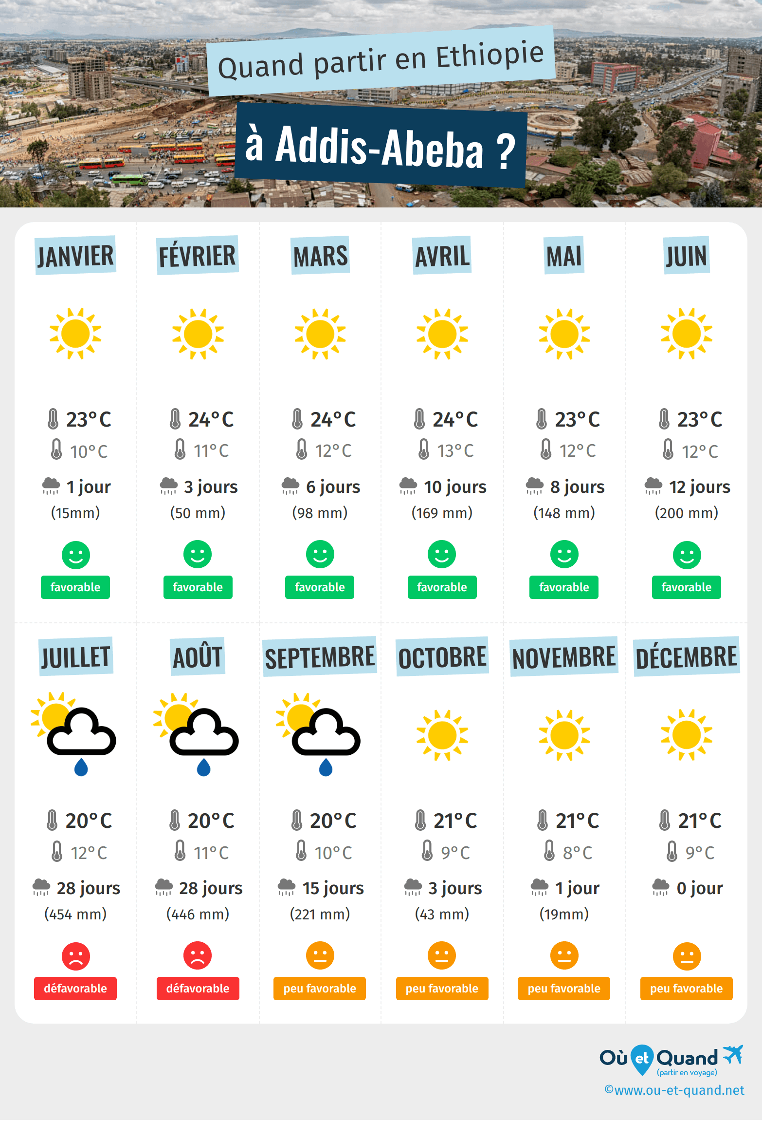 Quand partir à Addis-Abeba ? Voici quelques informations statistiques sur la météo à Addis-Abeba pour vous aider à trouver la meilleure période pour votre voyage :