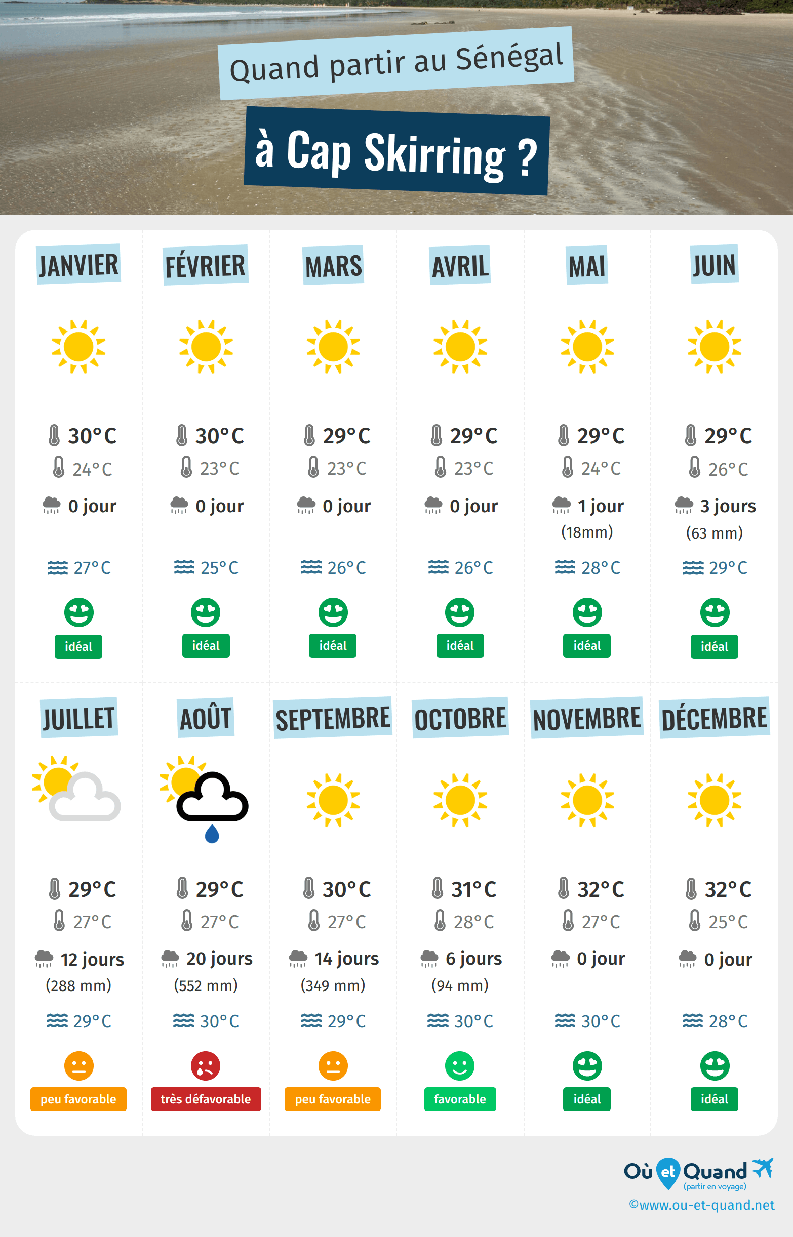 La température maximale à Cap Skirring est en moyenne de 30°C sur l'année (de 29°C en mai à 32°C en novembre). Il pleut 1380mm sur l'année, avec un minimum de 1mm en janvier et un maximum de 552mm en août. Le climat est agréable pour partir en voyage à Cap Skirring de Janvier à Juin et de Octobre à Décembre, mais la météo est vraiment idéale de Janvier à Juin, en Novembre et en Décembre. Pour se baigner, la meilleure période pour une température de l'eau convenable est de Juin à Décembre.
