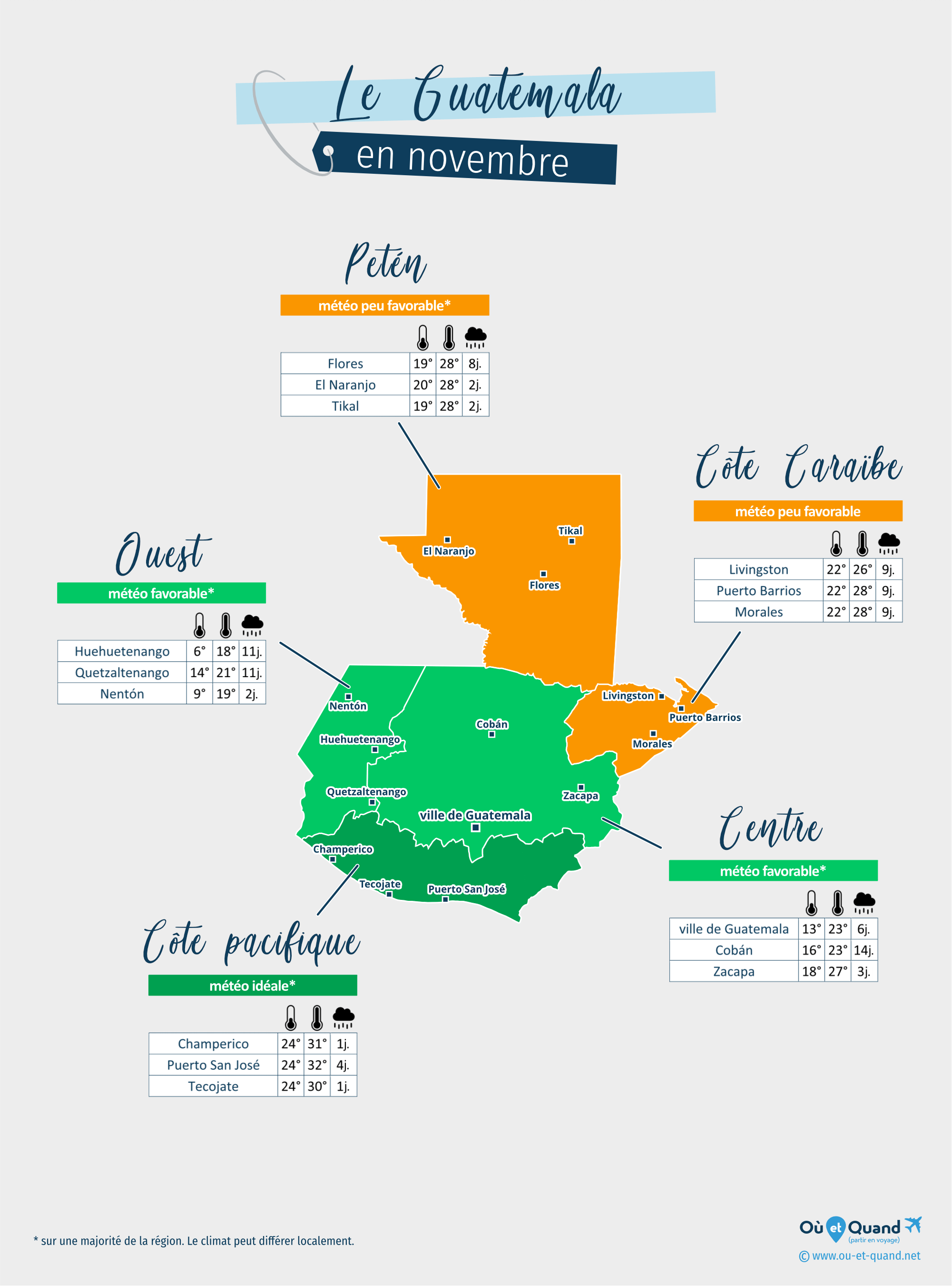 Découvrez sur la carte ci-dessous où aller au Guatemala pour visiter cette destination au mois de novembre avec les meilleures conditions climatiques.