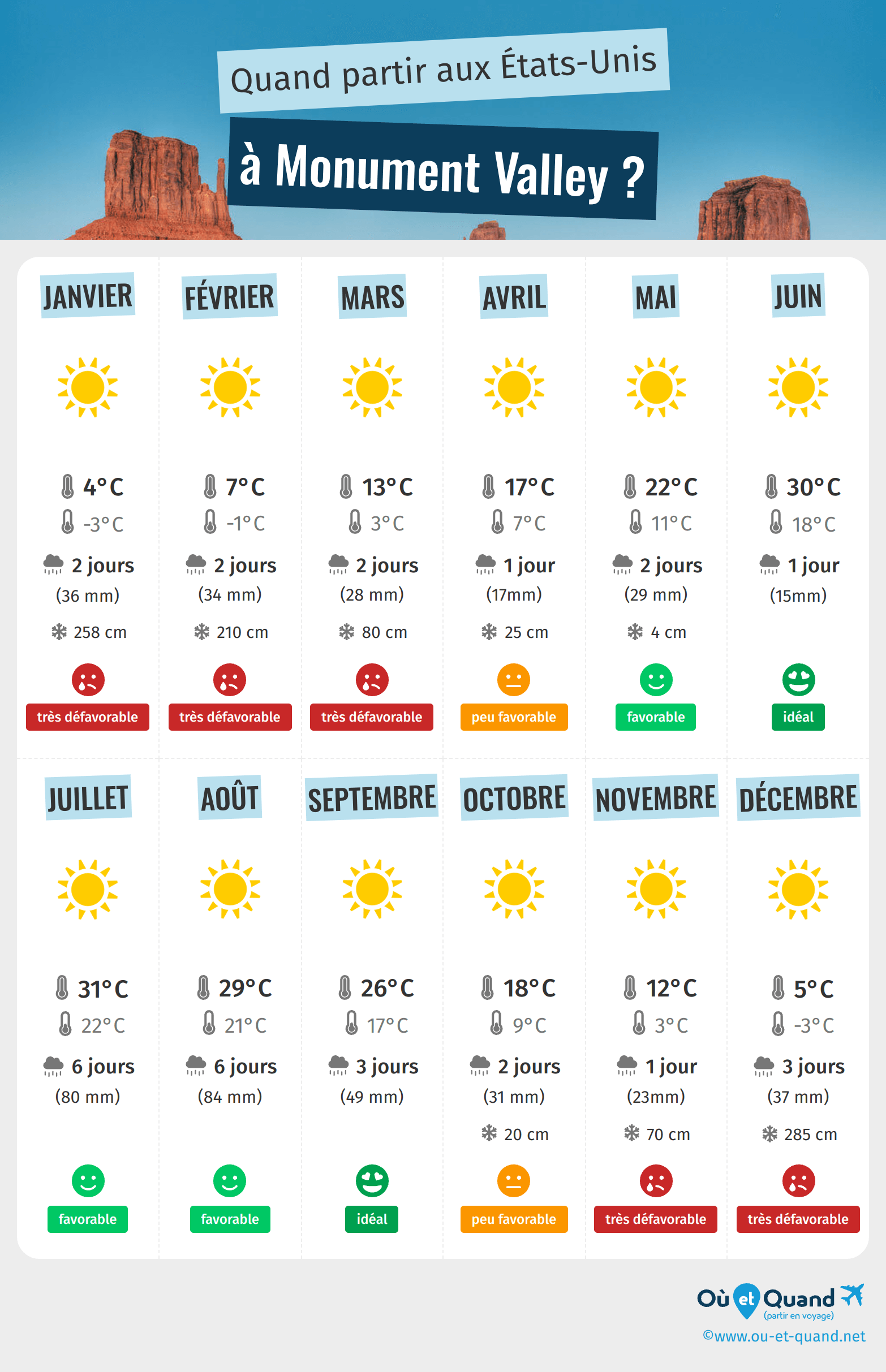 Pour obtenir toutes les informations sur le climat et la météo à Monument Valley d'un mois précis, cliquez sur le lien correspondant ci-dessous :