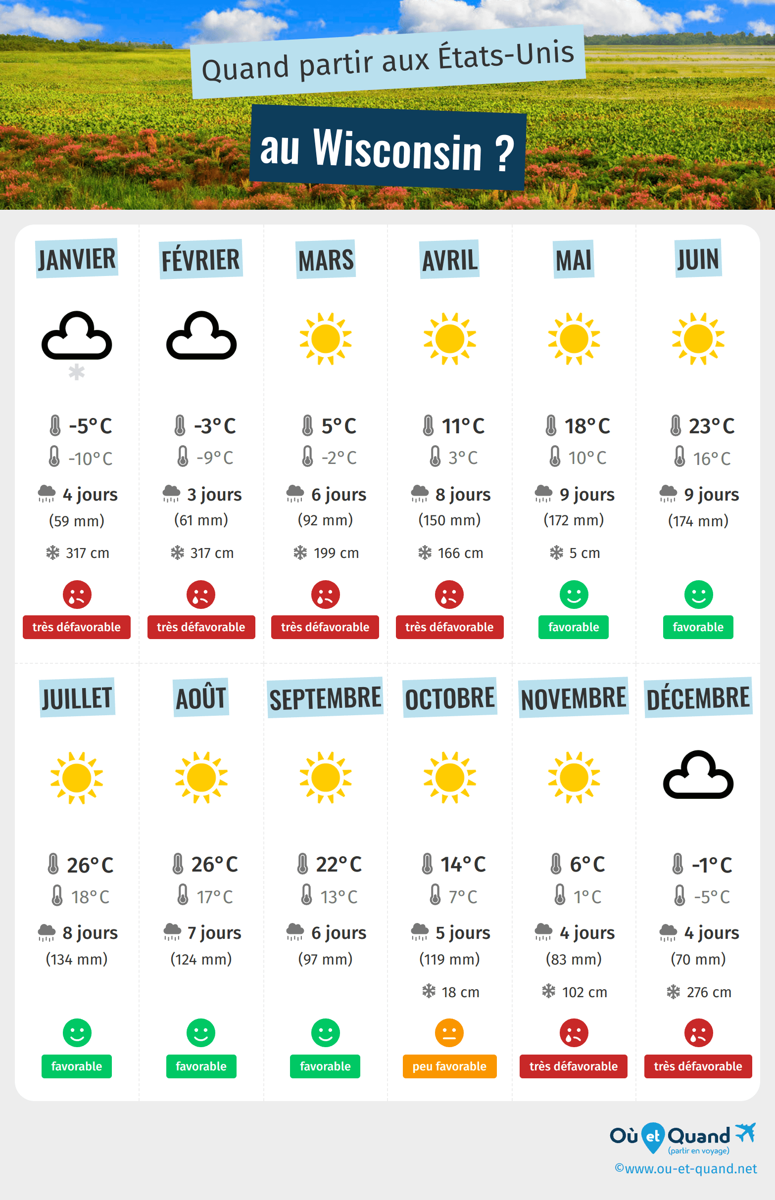 Quand partir au Wisconsin ? Voici quelques informations statistiques sur la météo au Wisconsin pour vous aider à trouver la meilleure période pour votre voyage :
