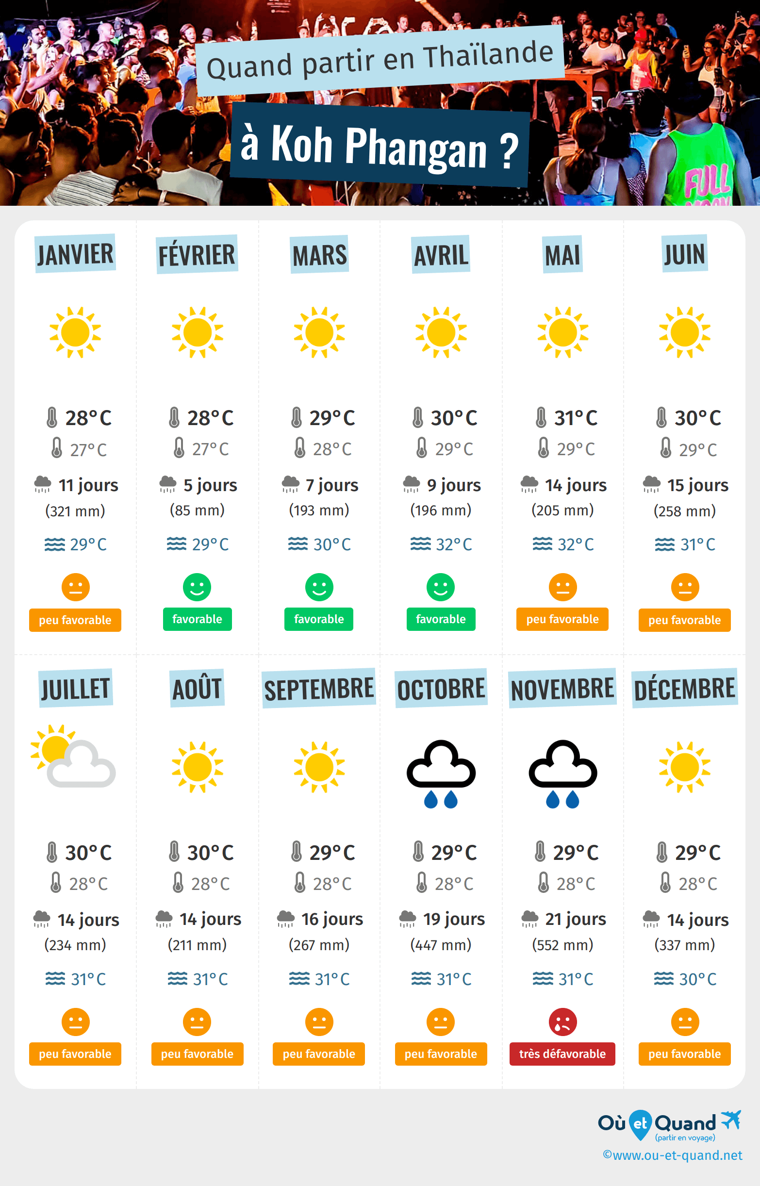Pour obtenir toutes les informations sur le climat et la météo à Koh Phangan d'un mois précis, cliquez sur le lien correspondant ci-dessous :