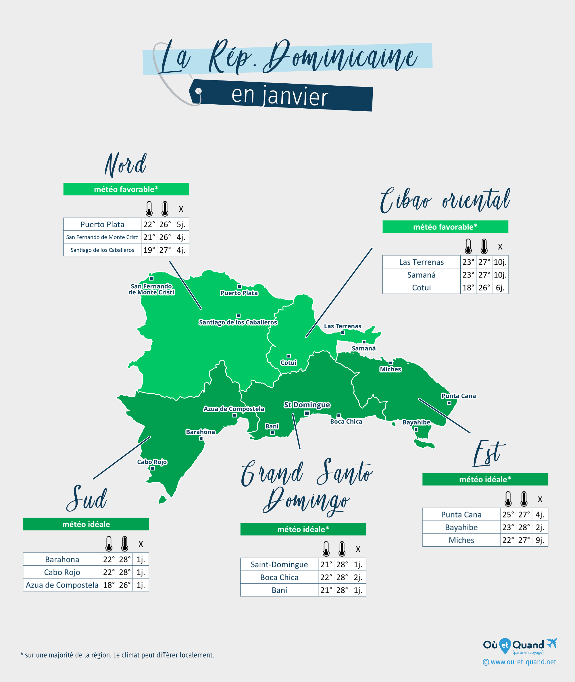 | Cibao oriental en janvier (Las Terrenas, Samaná, Cotui...) | 26 à 27°C | 6 à 10 jours | 27°C | favorable* |