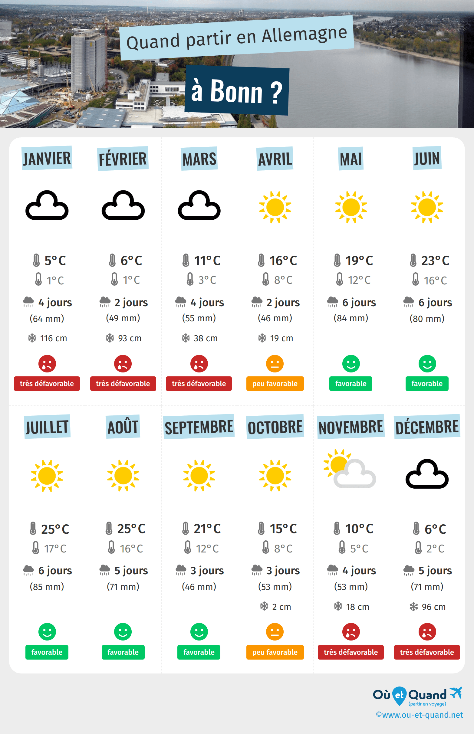 Pour obtenir toutes les informations sur le climat et la météo à Bonn d'un mois précis, cliquez sur le lien correspondant ci-dessous :