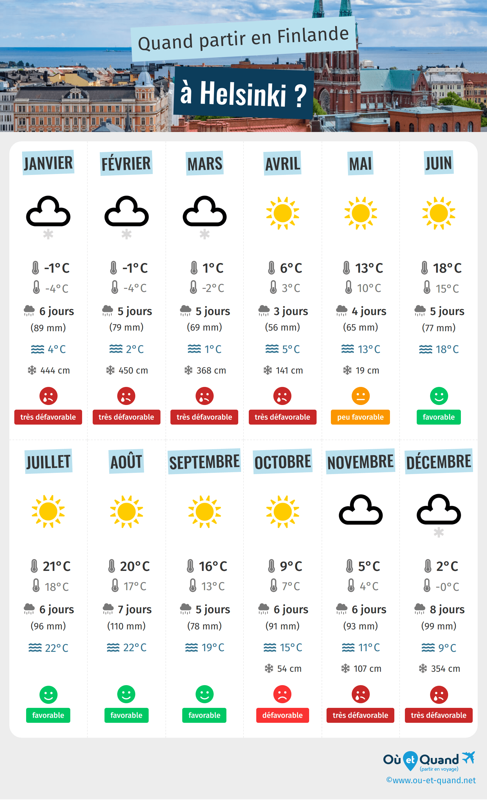 Quand partir à Helsinki ? Voici quelques informations statistiques sur la météo à Helsinki pour vous aider à trouver la meilleure période pour votre voyage :