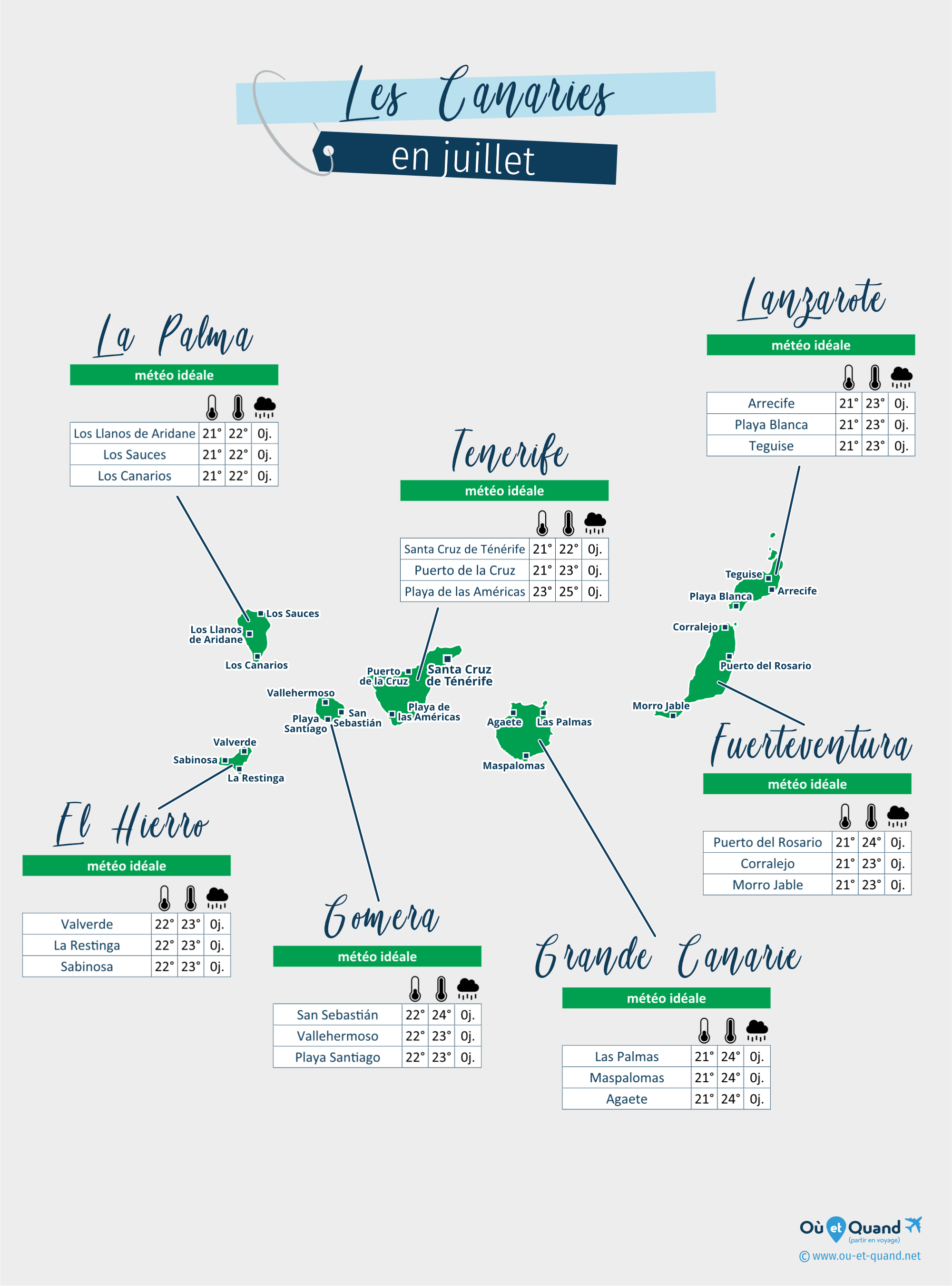 Découvrez sur la carte ci-dessous où aller aux Canaries pour visiter cette destination au mois de juillet avec les meilleures conditions climatiques.