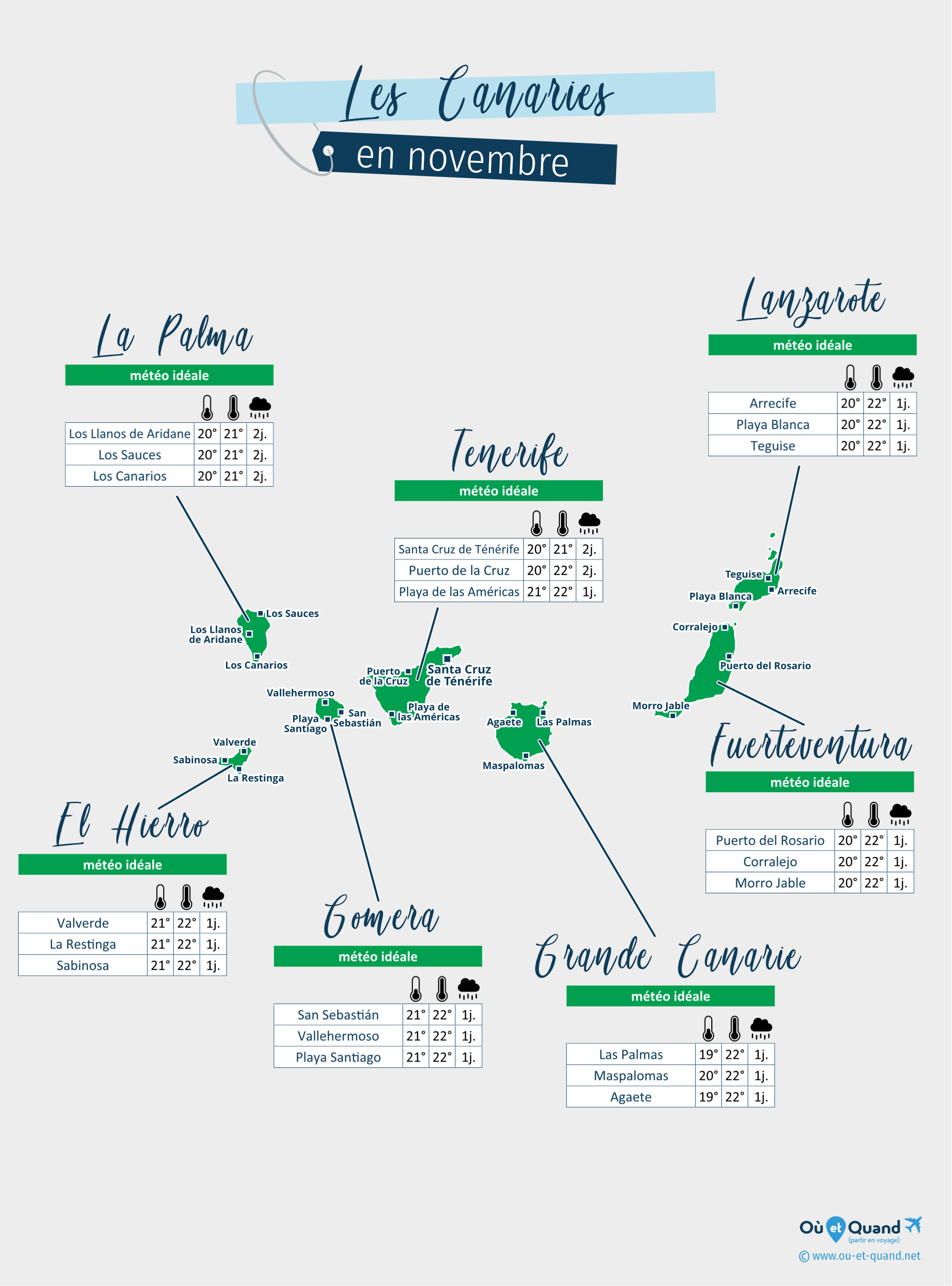 | Grande Canarie en novembre (Las Palmas, Maspalomas, Agaete...) | 22 à 23°C | 1 jour | 22 à 23°C | idéal |