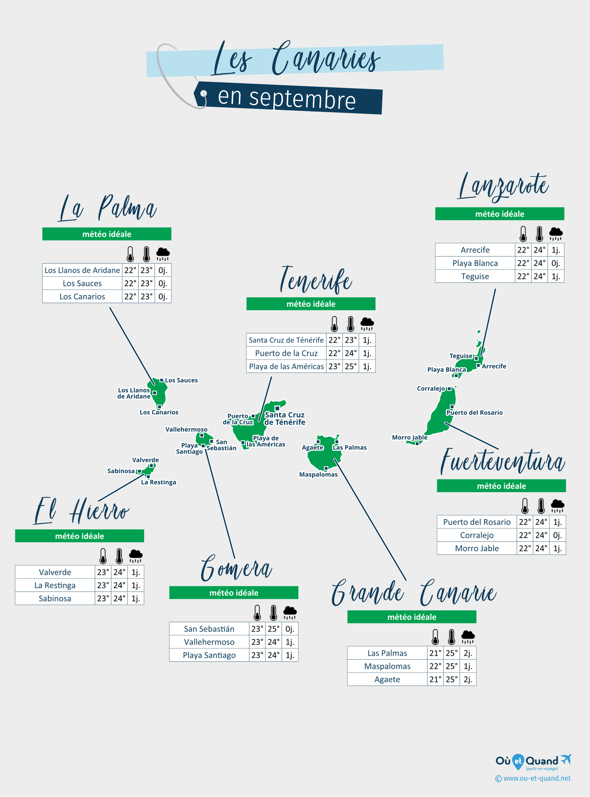 | Gomera en septembre (San Sebastián de La Gomera, Vallehermoso, Playa Santiago...) | 25°C | 0 à 1 jours | 24°C | idéal |