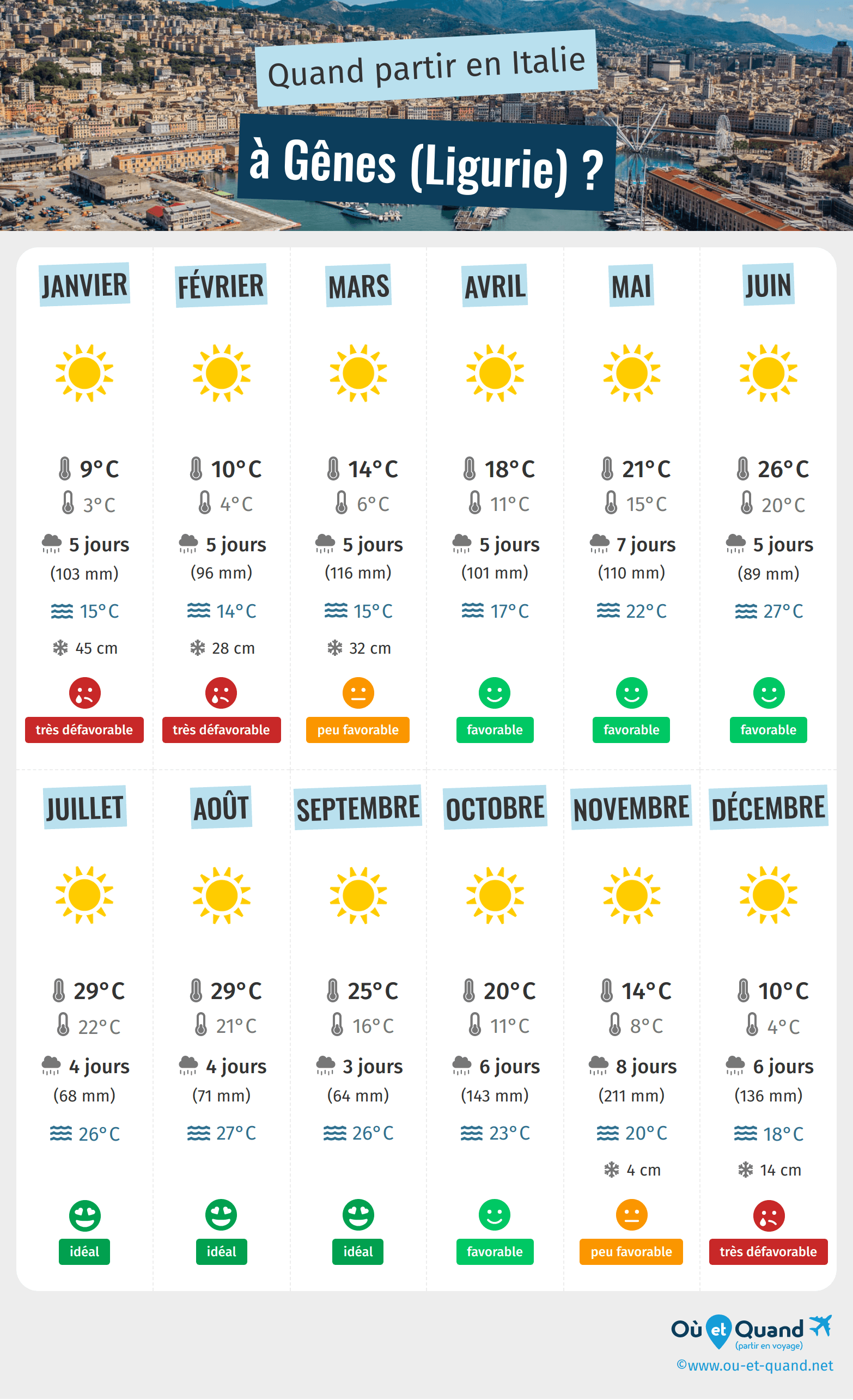 La température maximale à Gênes (Ligurie) est en moyenne de 19°C sur l'année (de 9°C en janvier à 29°C en août). Il pleut 1304mm sur l'année, avec un minimum de 64mm en septembre et un maximum de 211mm en novembre. Le climat est agréable pour partir en voyage à Gênes de Avril à Octobre, mais la météo est vraiment idéale de Juillet à Septembre. Pour se baigner, la meilleure période pour une température de l'eau convenable est de Juin à Septembre.