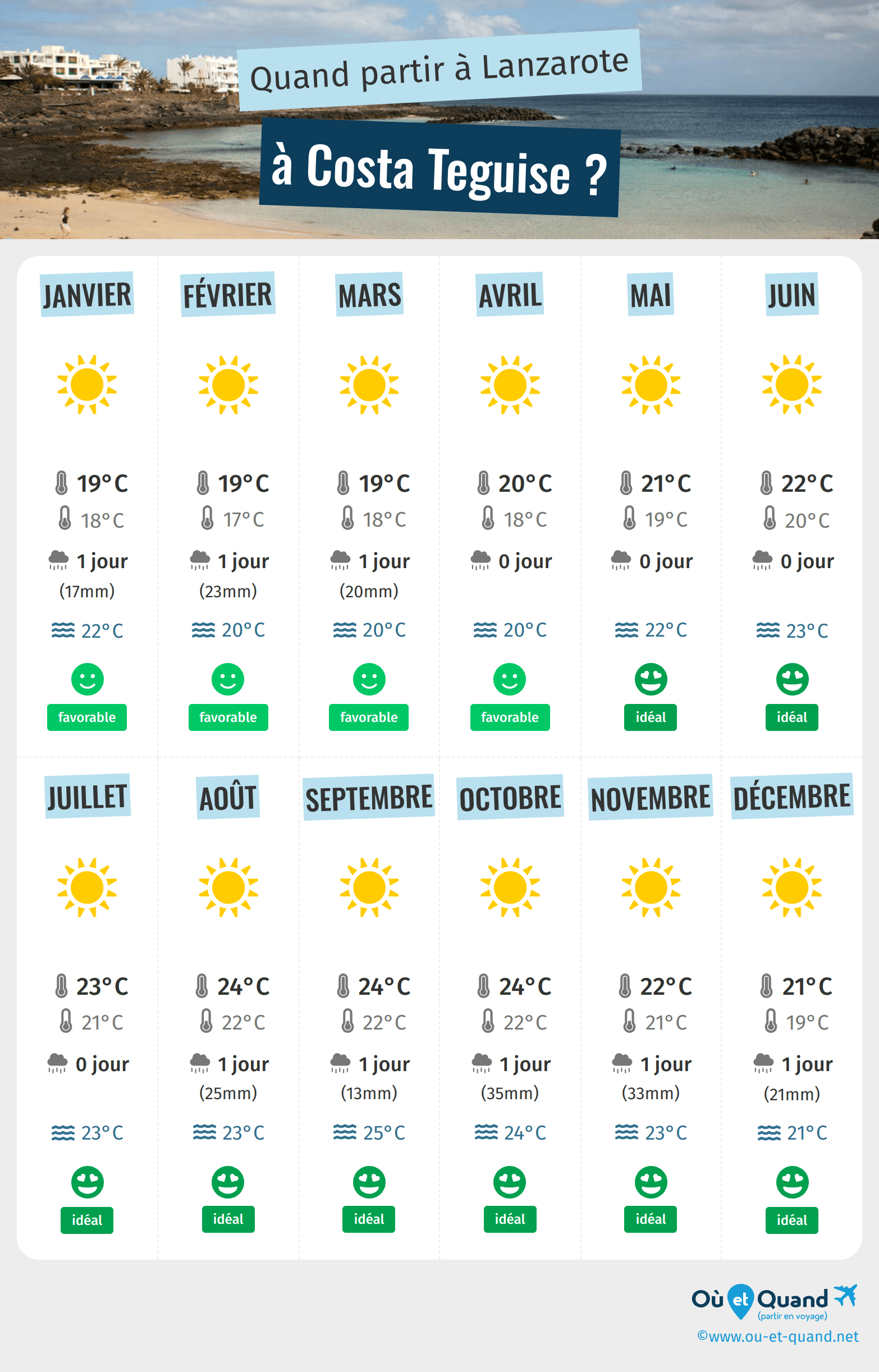 La température maximale à Costa Teguise est en moyenne de 22°C sur l'année (de 19°C en février à 24°C en août). Il pleut 217mm sur l'année, avec un minimum de 5mm en juillet et un maximum de 35mm en octobre. Le climat est agréable pour partir en voyage à Costa Teguise toute l'année, mais la météo est vraiment idéale de Mai à Décembre. Pour se baigner, la meilleure période pour une température de l'eau convenable est de Juillet à Novembre.