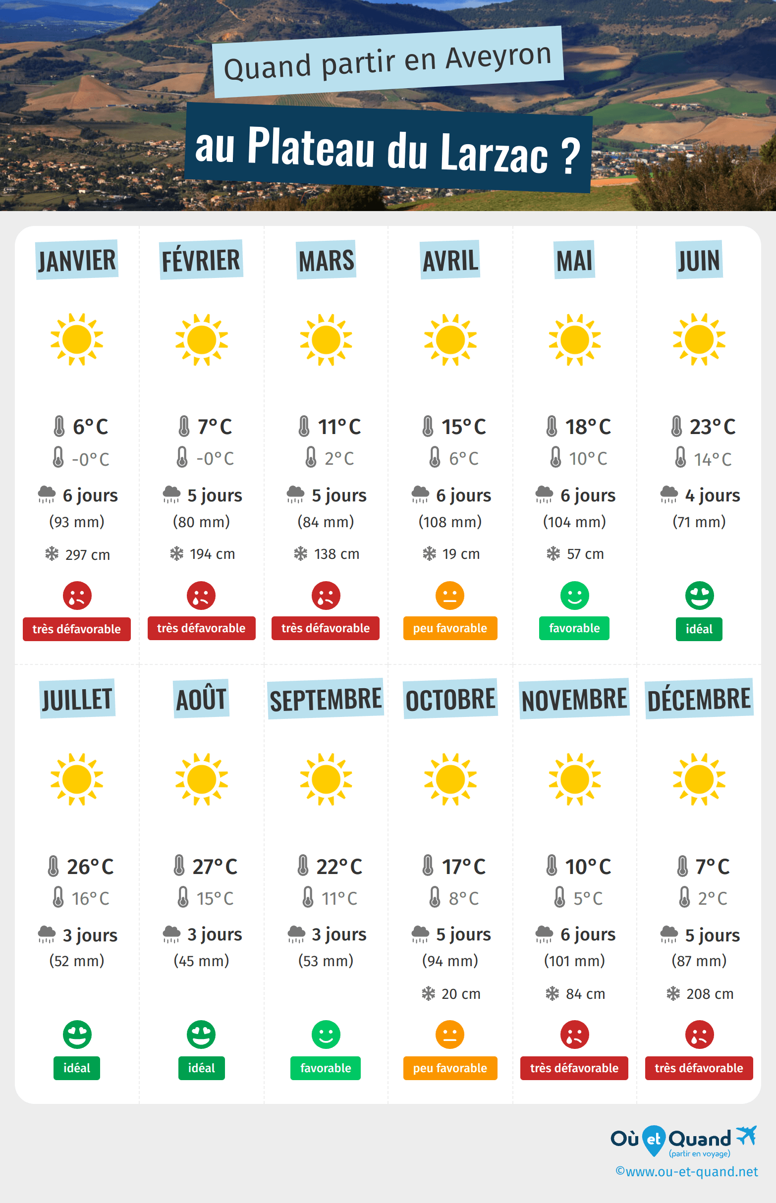 Quand partir au Larzac ? Voici quelques informations statistiques sur la météo au Larzac pour vous aider à trouver la meilleure période pour votre voyage :