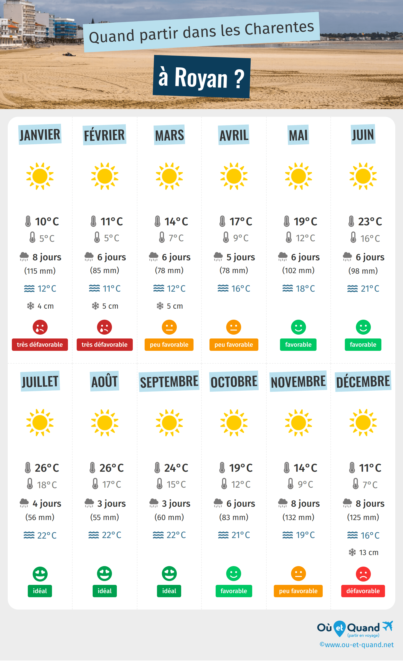 Pour obtenir toutes les informations sur le climat et la météo à Royan d'un mois précis, cliquez sur le lien correspondant ci-dessous :