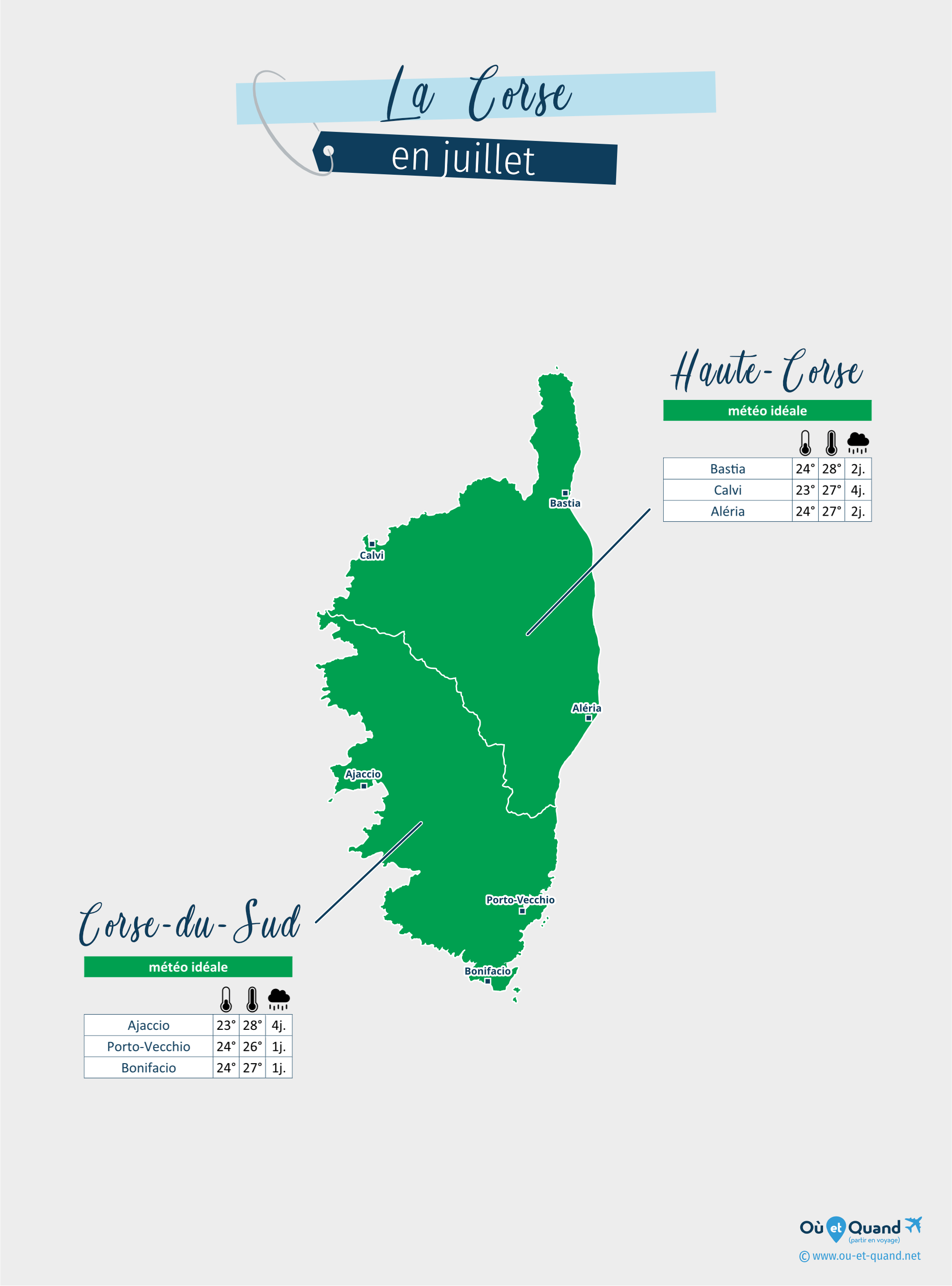 Découvrez sur la carte ci-dessous où aller en Corse pour visiter cette destination au mois de juillet avec les meilleures conditions climatiques.