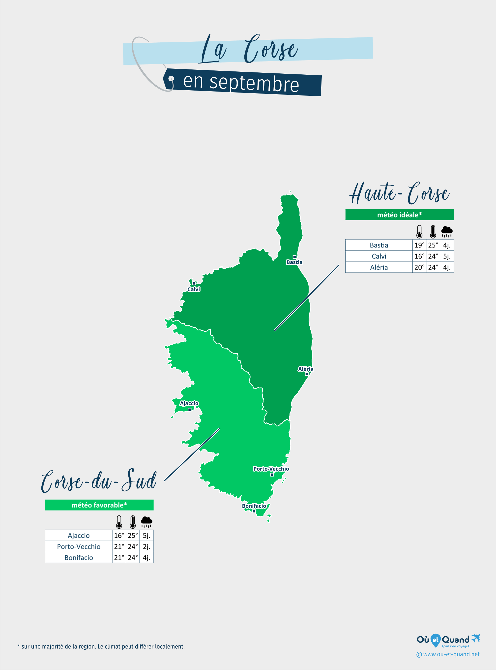 Découvrez sur la carte ci-dessous où aller en Corse pour visiter cette destination au mois de septembre avec les meilleures conditions climatiques.