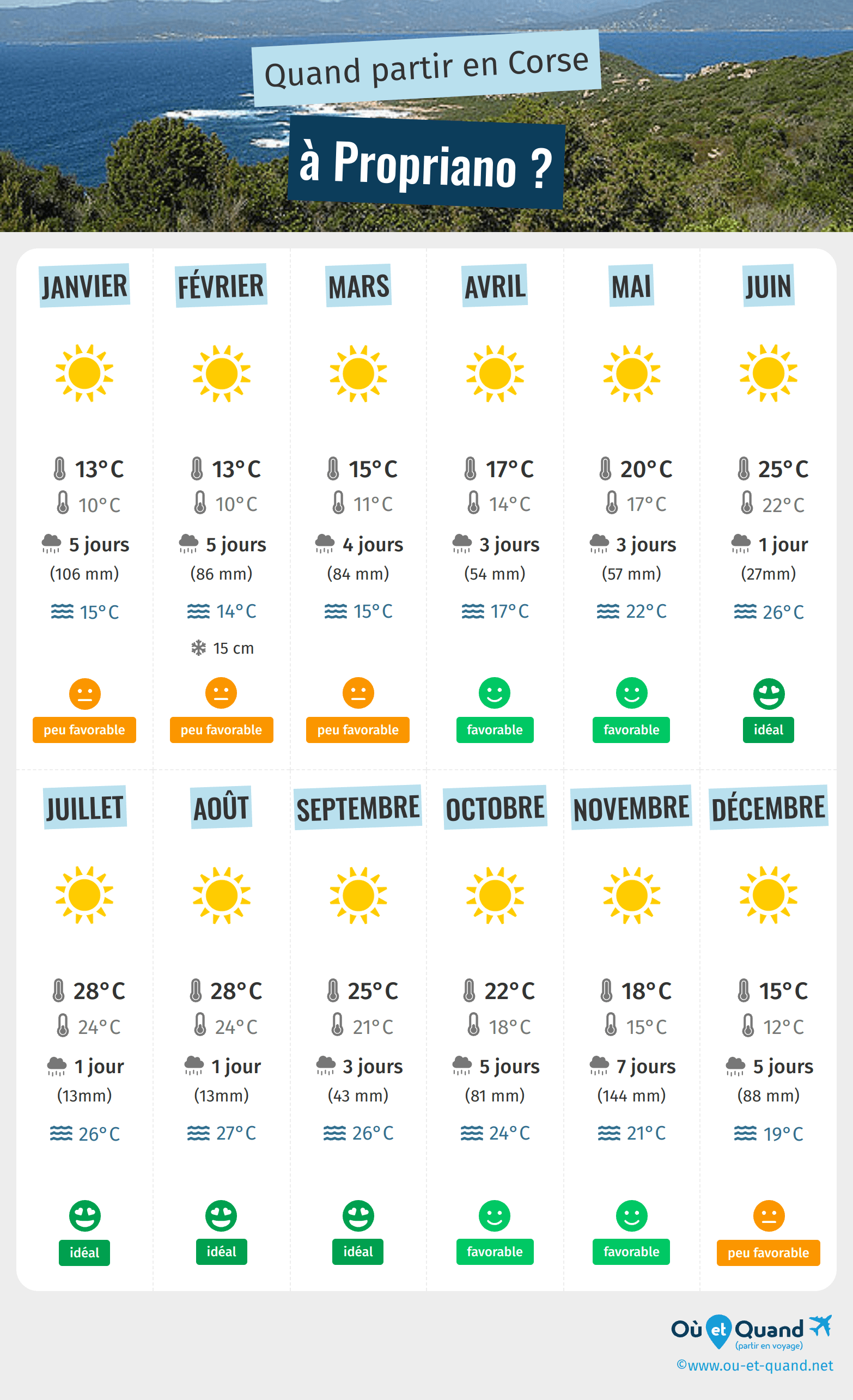 Pour obtenir toutes les informations sur le climat et la météo à Propriano d'un mois précis, cliquez sur le lien correspondant ci-dessous :