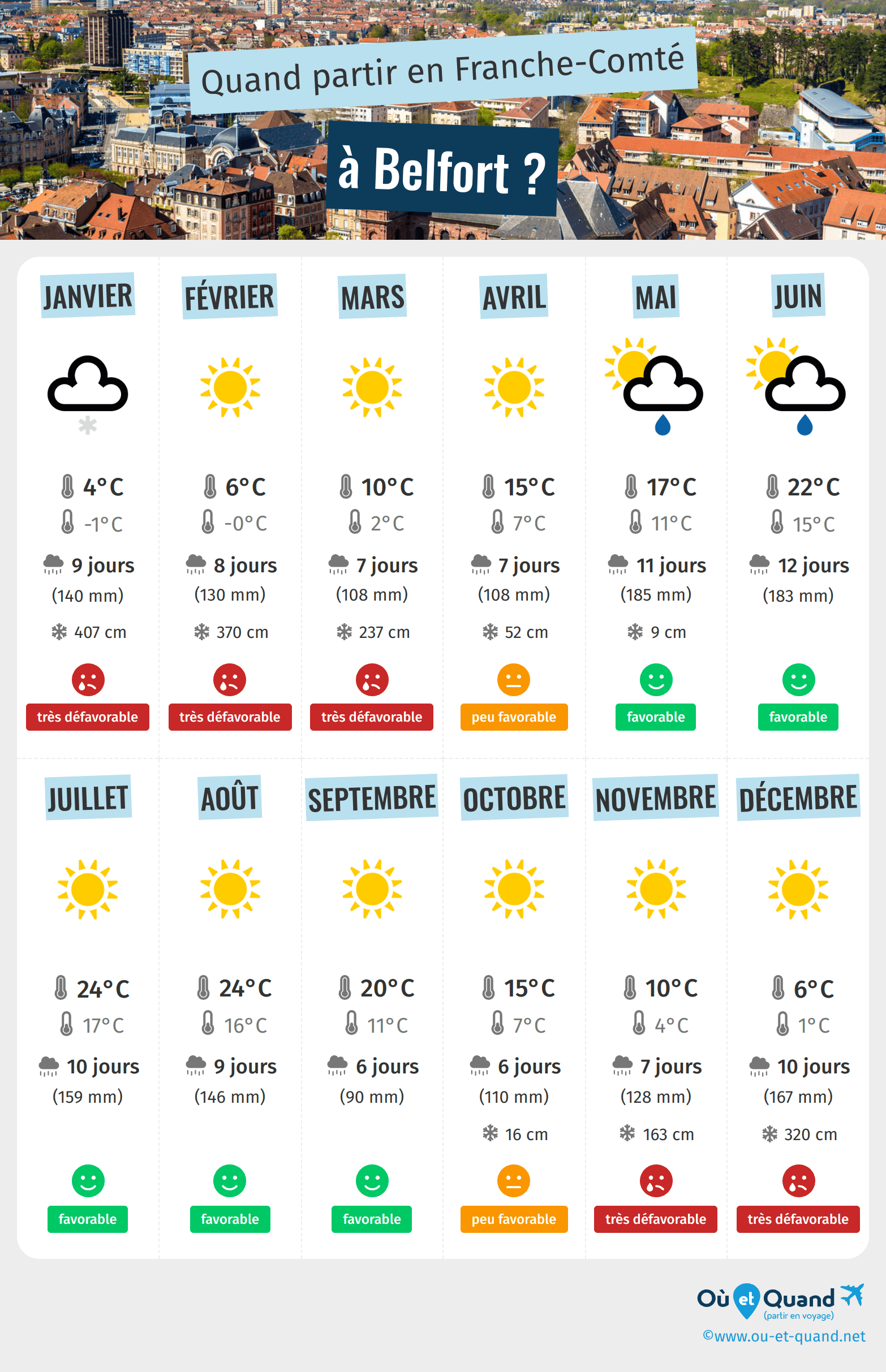 Pour obtenir toutes les informations sur le climat et la météo à Belfort d'un mois précis, cliquez sur le lien correspondant ci-dessous :