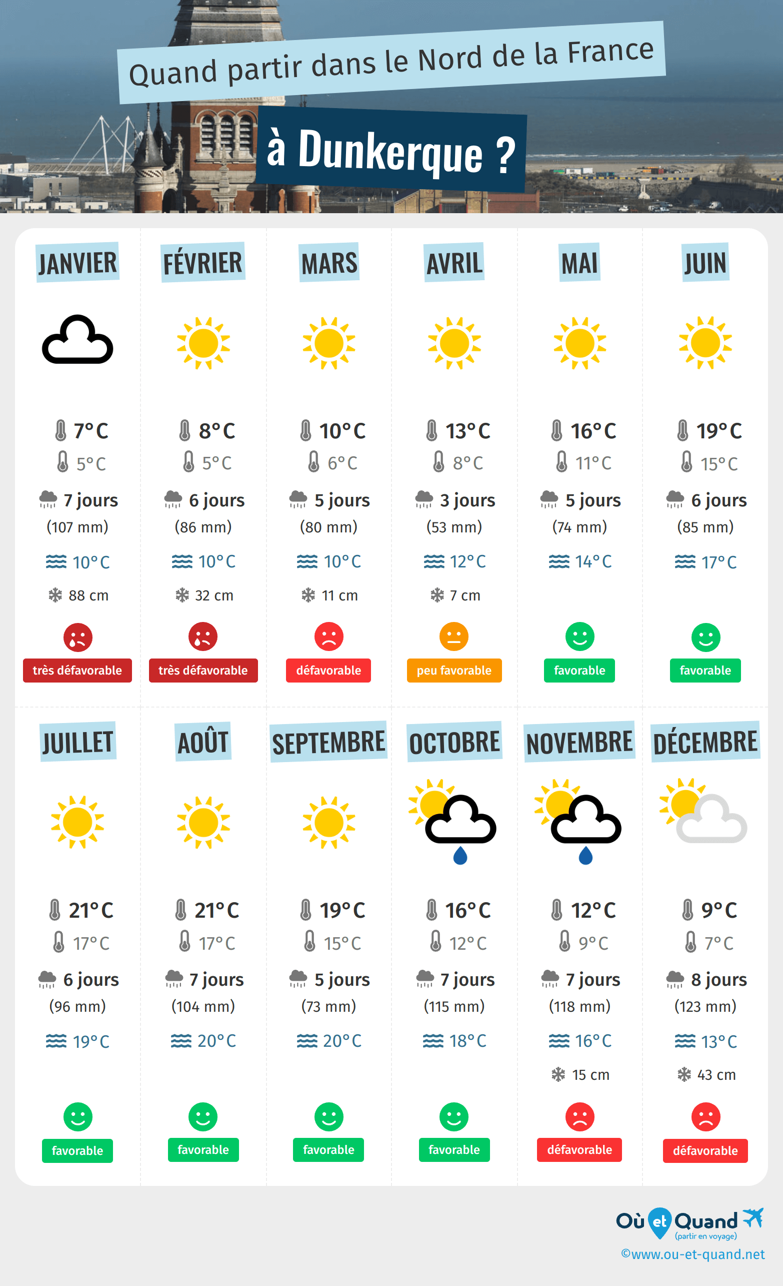 Pour obtenir toutes les informations sur le climat et la météo à Dunkerque d'un mois précis, cliquez sur le lien correspondant ci-dessous :