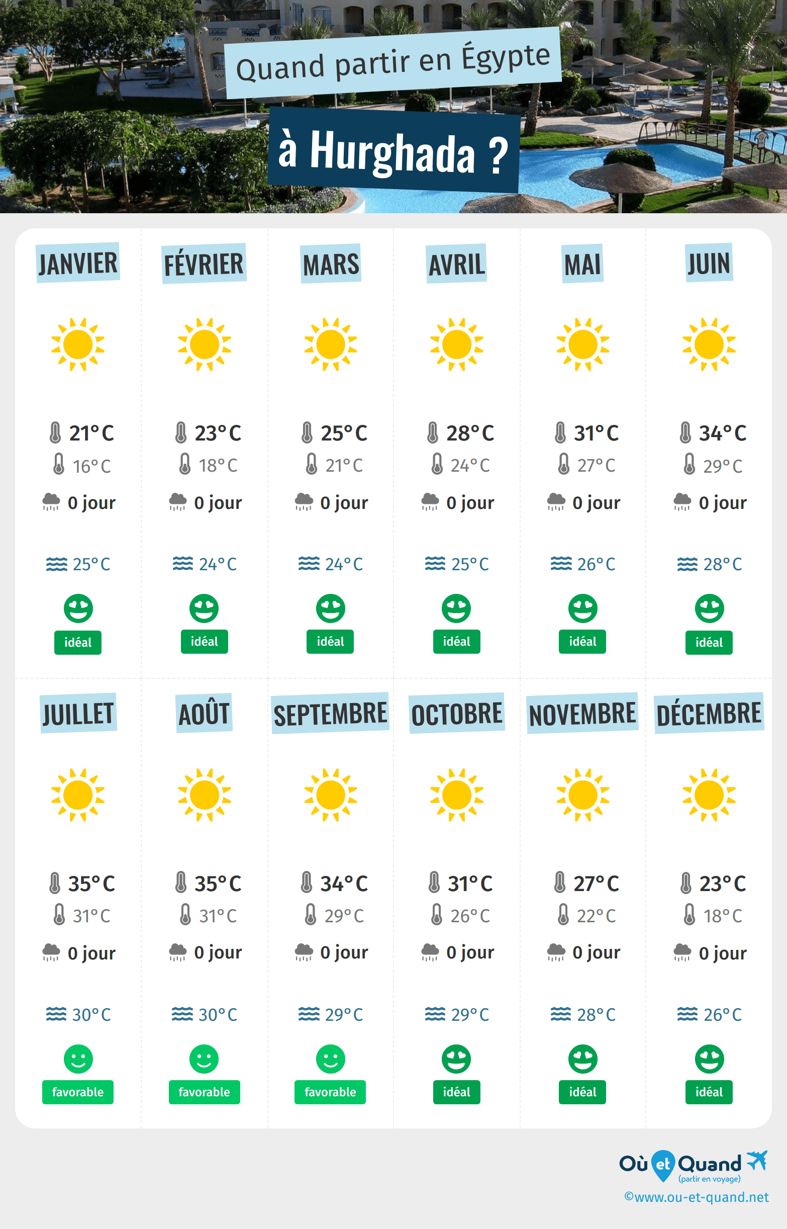 La meilleure période pour visiter Hurghada, cette perle égyptienne située sur la côte de la Mer Rouge, est presque toute l'année. En effet, grâce à son climat désertique, Hurghada bénéficie d'une météo favorable 12 mois sur 12. Toutefois, la période vraiment idéale, où la météo est la plus clémente, s'étend de janvier à juin, puis reprend en octobre jusqu'à décembre. Les mois de Juillet à Septembre peuvent être synonymes de chaleur écrasante.