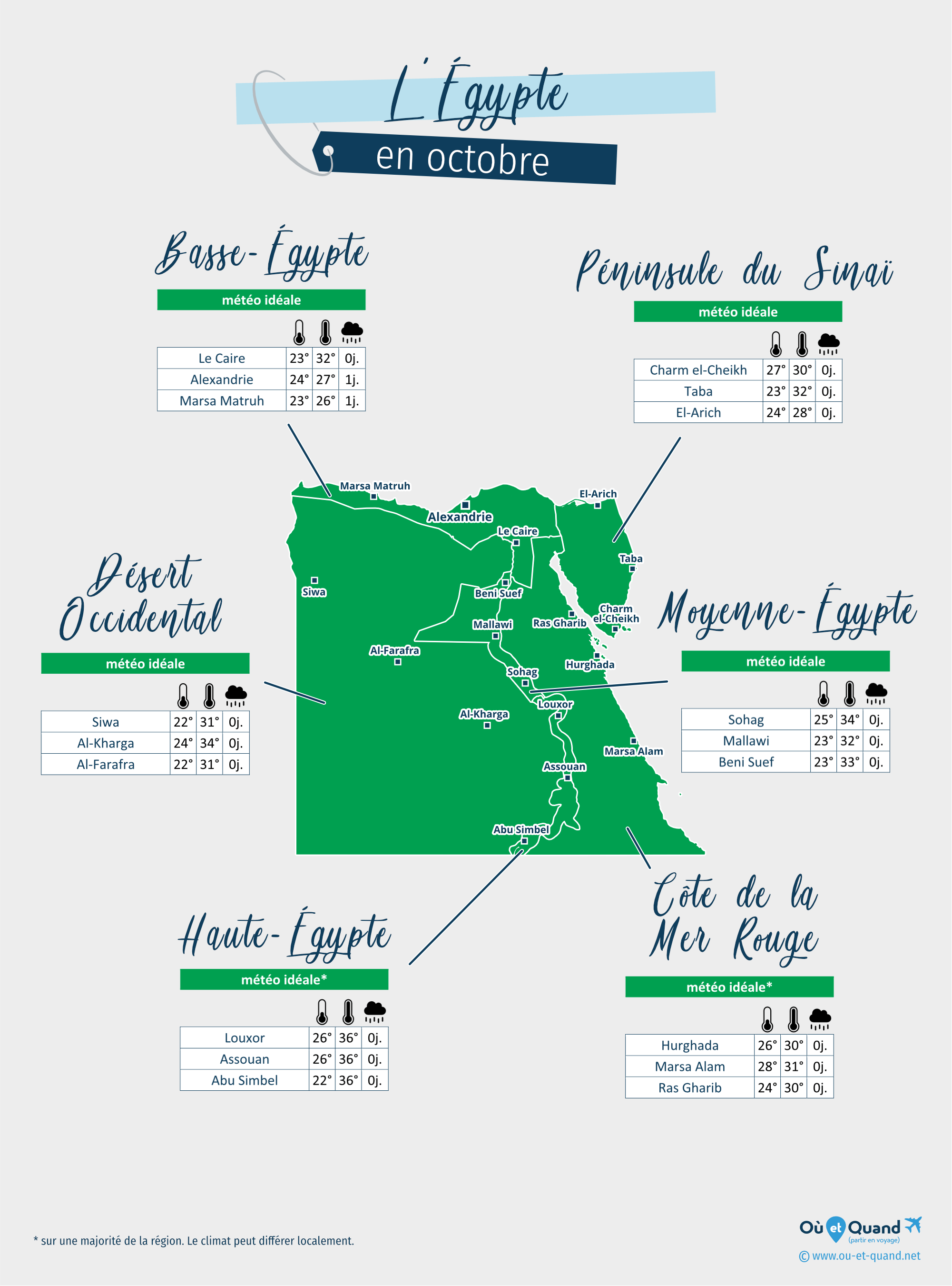 | Désert occidental en octobre (Siwa, Al-Kharga, Al-Farafra...) | 30 à 34°C | 0 jour | idéal | |
