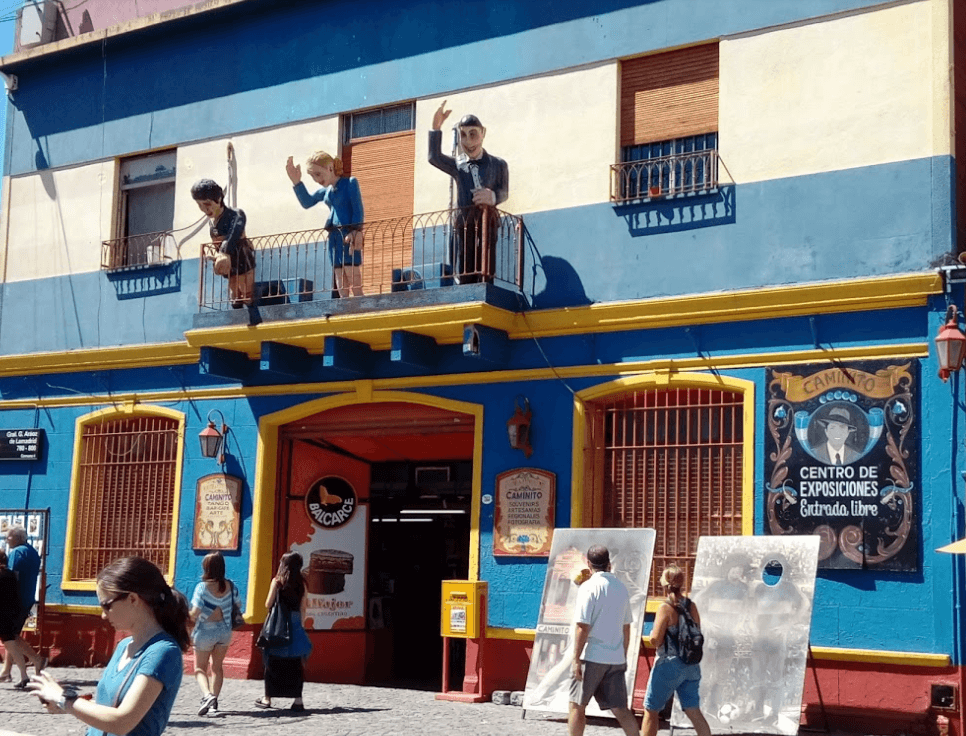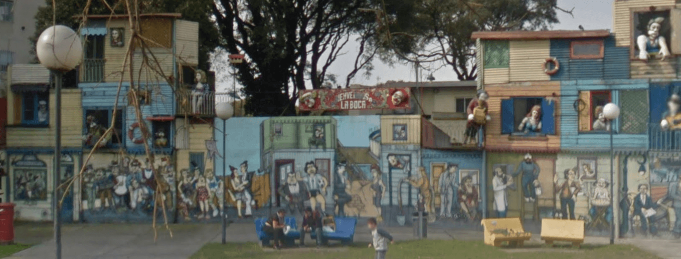 Des artistes ont recréé sur des murs, une scène de quartier typique dans laquelle on retrouve des personnages argentins célèbres tels que le bandonéoniste Aníbal Troilo, Diego Maradona et le peintre de La Boca, Benito Quinquela Martín.