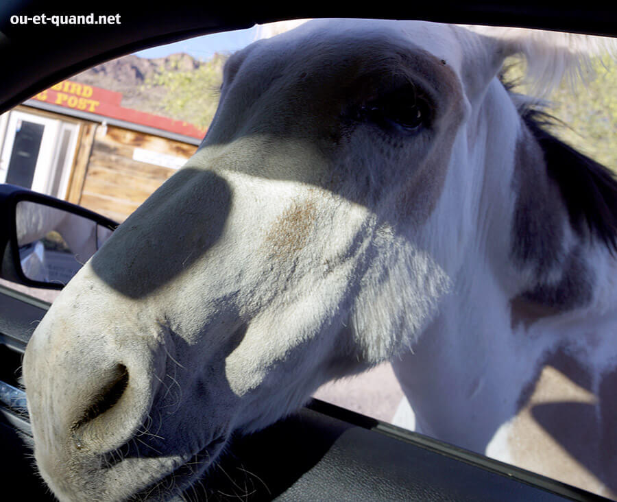 Lorsque vous prenez la route 66 entre Needle et Kingman en Arizona, vous passez par Oatman. C’est la seule ville de cette partie de la route. Hormis quelques magasins et restaurants, l’attraction ici est les mules en liberté un peu partout. Même dans la ville ! Les mules semblent habituées aux touristes et viennent quémander de la nourriture directement dans les voitures !