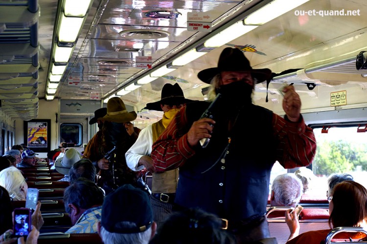 Mais là n’est pas la seule attraction dans cette ville ! La gare de Williams dessert quotidiennement le Grand Canyon (versant sud). Ce train touristique vous mènera directement au bord du Grand Canyon. Et « Touristique » prend ici tout son sens : vous ne vous ennuierez pas une seconde à l’aller comme au retour car on vous sert ici de l’entertainement à l’américaine : animateur dans chaque wagon, des groupes de musique et même une attaque de train par des cow boys ! On aime ou on n’aime pas, moi j’ai pris le parti d’en rire ; et la bonne ambiance dans le train étant communicative, j’ai passé finalement un agréable moment.