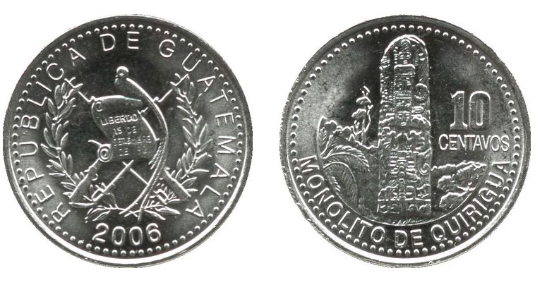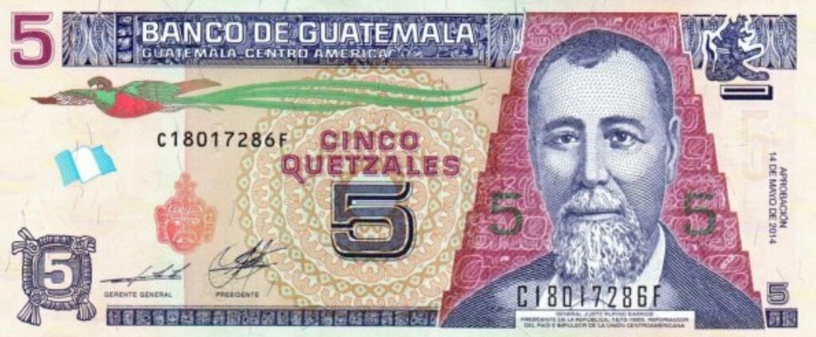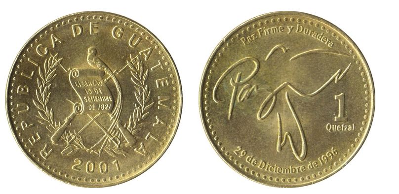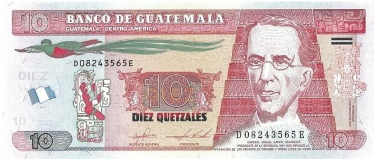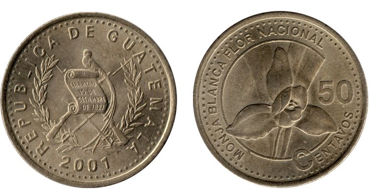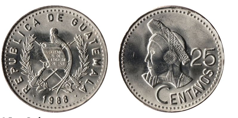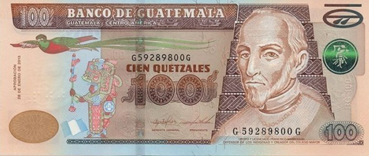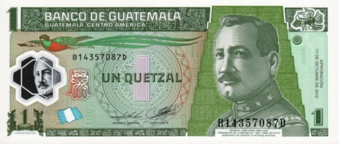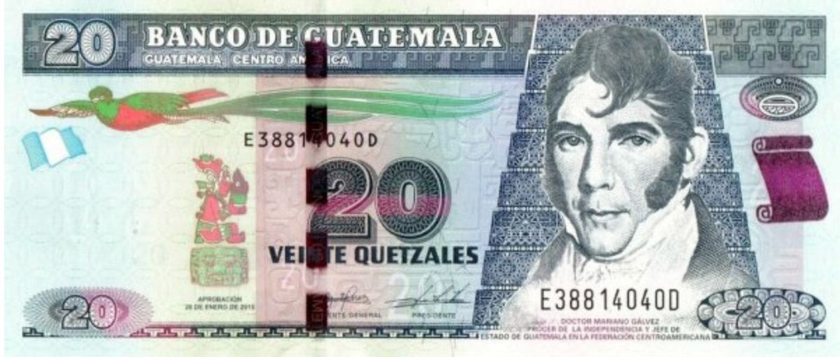 Voici la liste et le visuel des principaux billets (1 GTQ, 5 GTQ, 10 GTQ, 20 GTQ, 50 GTQ, 100 GTQ, 200 GTQ) et pièces (0.01 GTQ, 0.05 GTQ, 0.1 GTQ, 0.25 GTQ, 0.5 GTQ, 1 GTQ) en Quetzal actuellement en circulation à ville de Guatemala au Guatemala.
