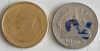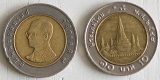 Il importe de signalerla ressemblance entre la pièce de monnaie de 10 ฿ et celle de 2 euros : même diamètre, même épaisseur, même bimétallisme (bande argentée autour d'un disque doré).