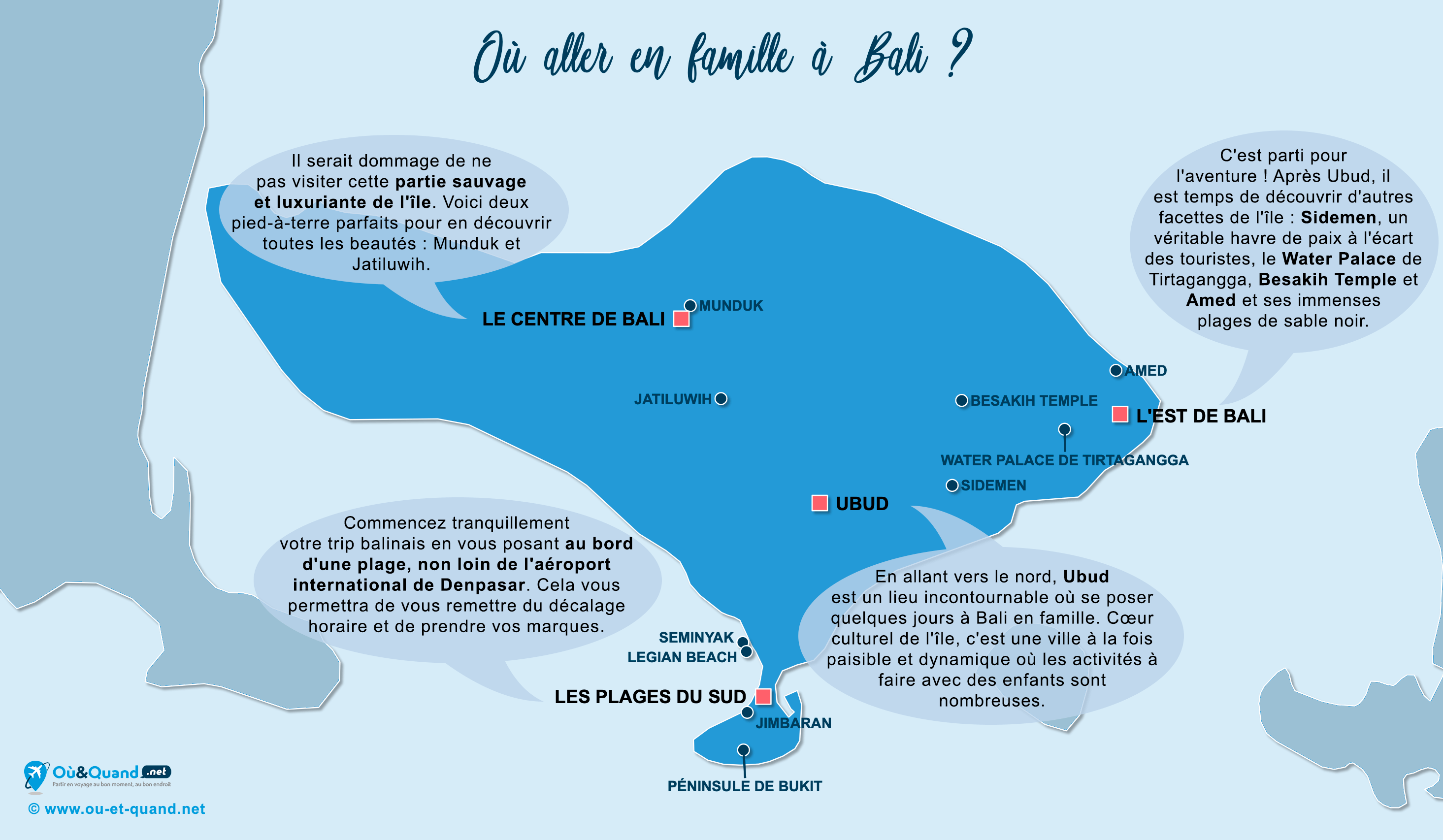 Pour y voir plus clair dans nos recommandations de régions et de villes à Bali où aller en famille, les voici réunies sur une carte de Bali :