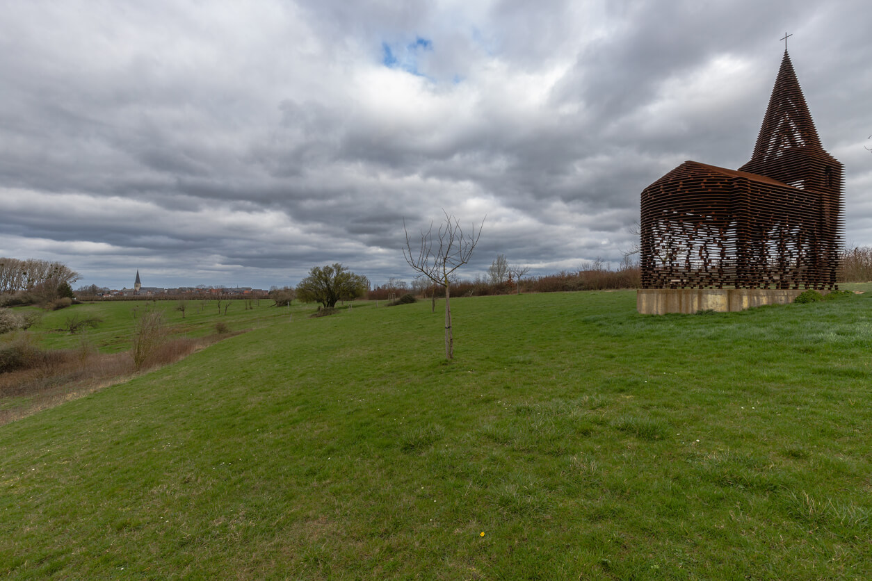 Cette œuvre originale est intitulée « Read between the lines », que l'on peut traduire par « lisez entre les lignes ». Selon l'angle, on y voit soit une église, soit de simples lattes d'acier suspendues. L'effet est assez étonnant, en plein milieu de la campagne flamande. C'est un lieu secret à voir en Belgique !