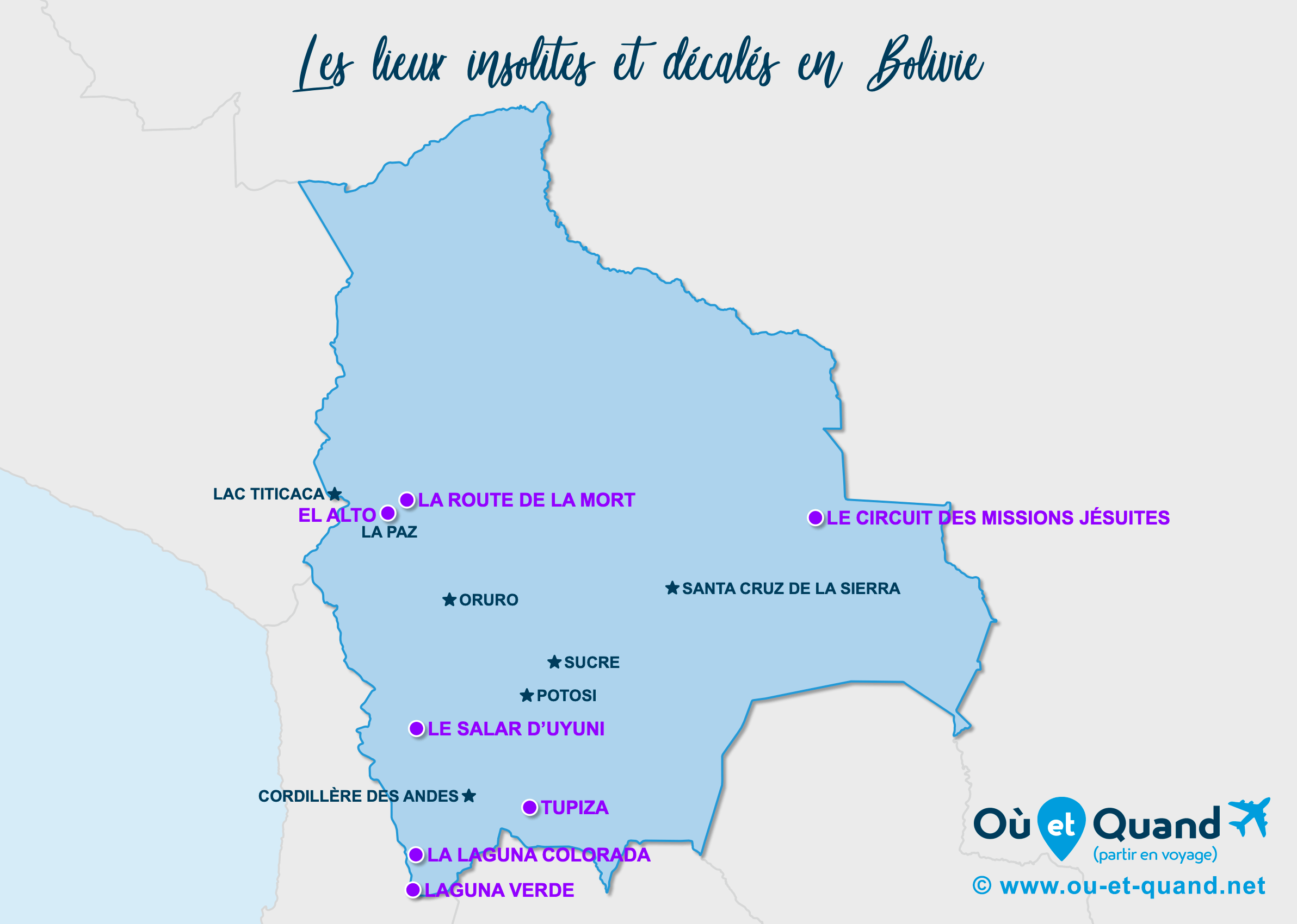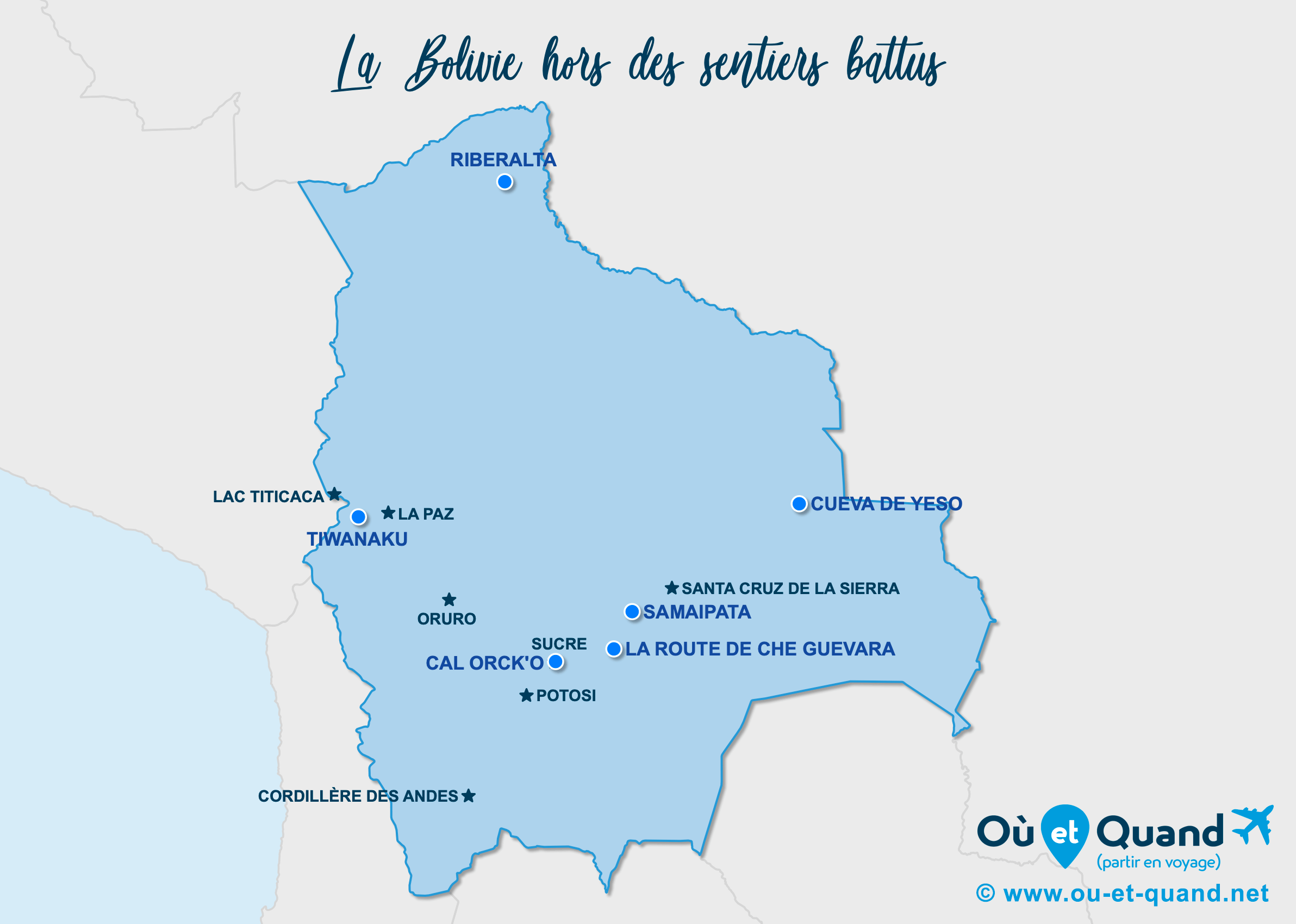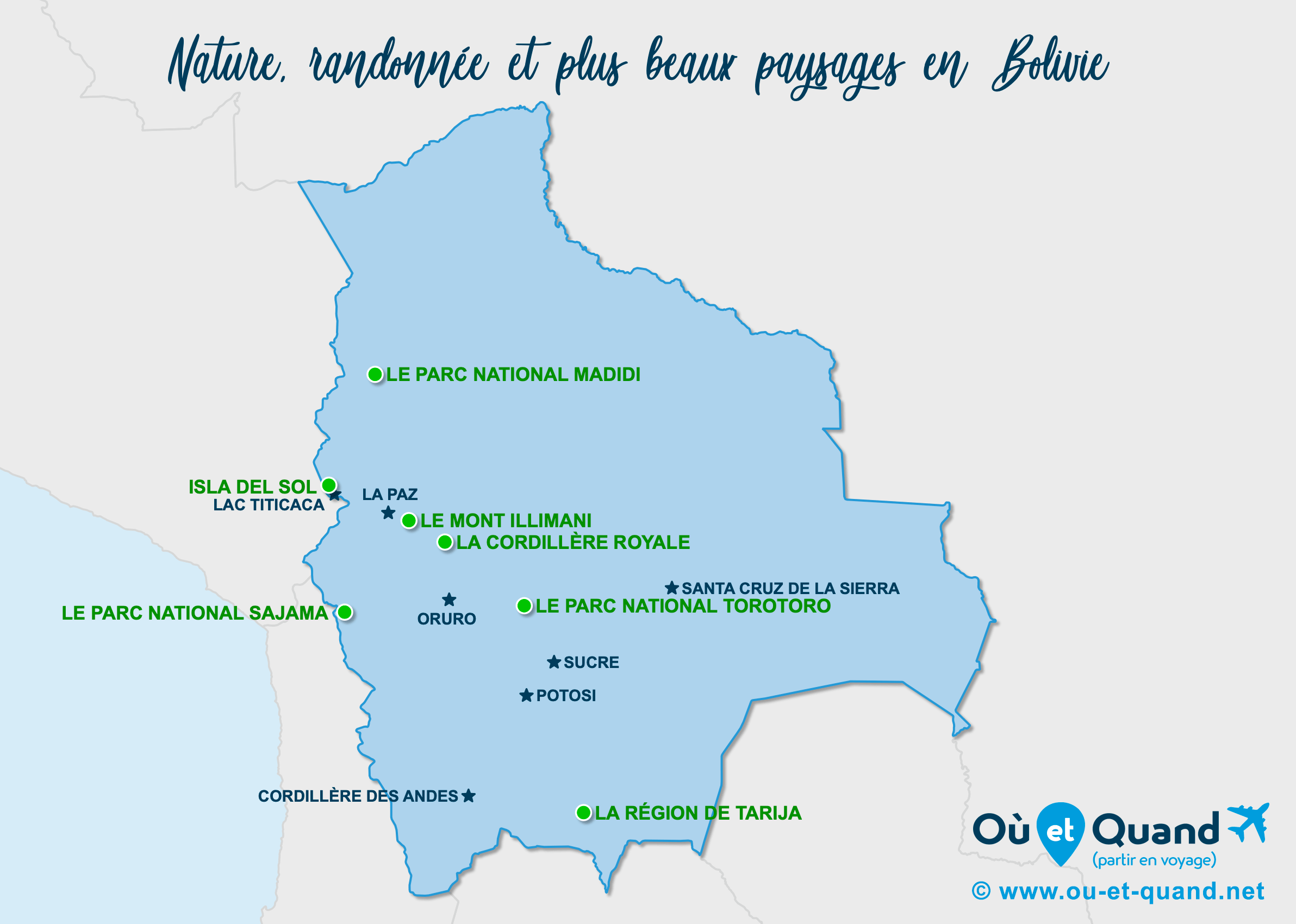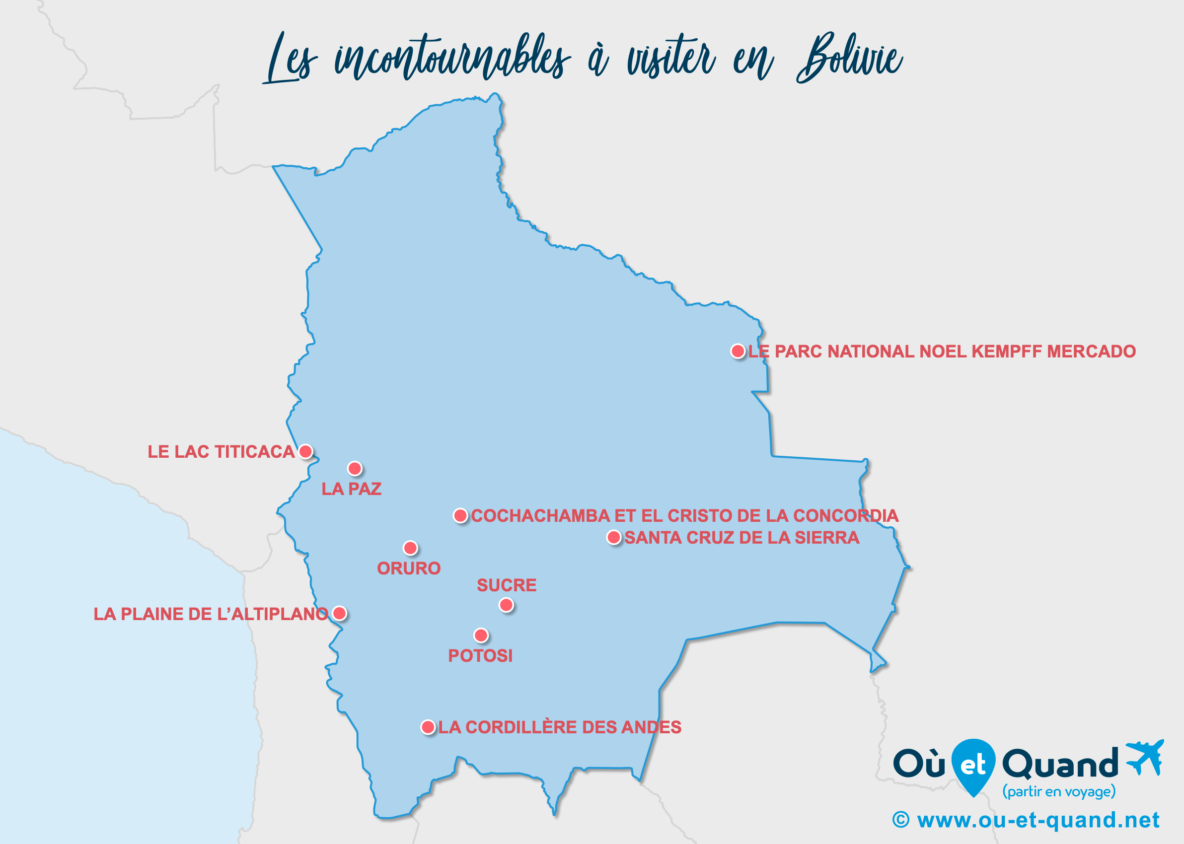 Vous prévoyez un futur voyage en Bolivie ? Vous vous demandez quelles régions privilégier ? Quels sont les grands incontournables à visiter en Bolivie ? Découvrez notre sélection de 30 lieux ! La Bolivie est un pays d'Amérique du Sud frontalier du Pérou, du Brésil, du Chili, du Paraguay et de l'Argentine. Vous découvrirez des paysages très divers : la vaste cordillère des Andes, la forêt tropicale amazonienne, des hectares de sel d'un blanc éclatant et même des volcans ! Où aller en Bolivie pour en prendre plein la vue ? Quels sont les endroits plus méconnus ? Où faire de la randonnée ? Notre carte touristique vous aidera à construire votre séjour !