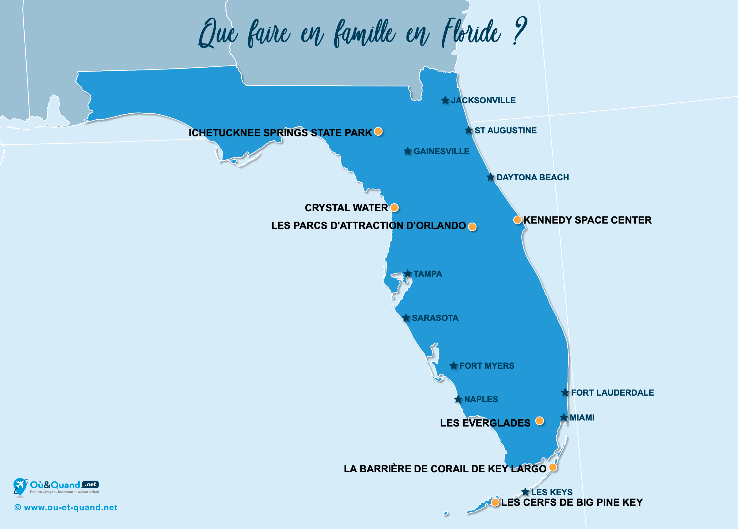 Pour y voir plus clair dans nos recommandations de régions et de villes en Floride où aller en famille, les voici réunies sur une carte de la Floride :