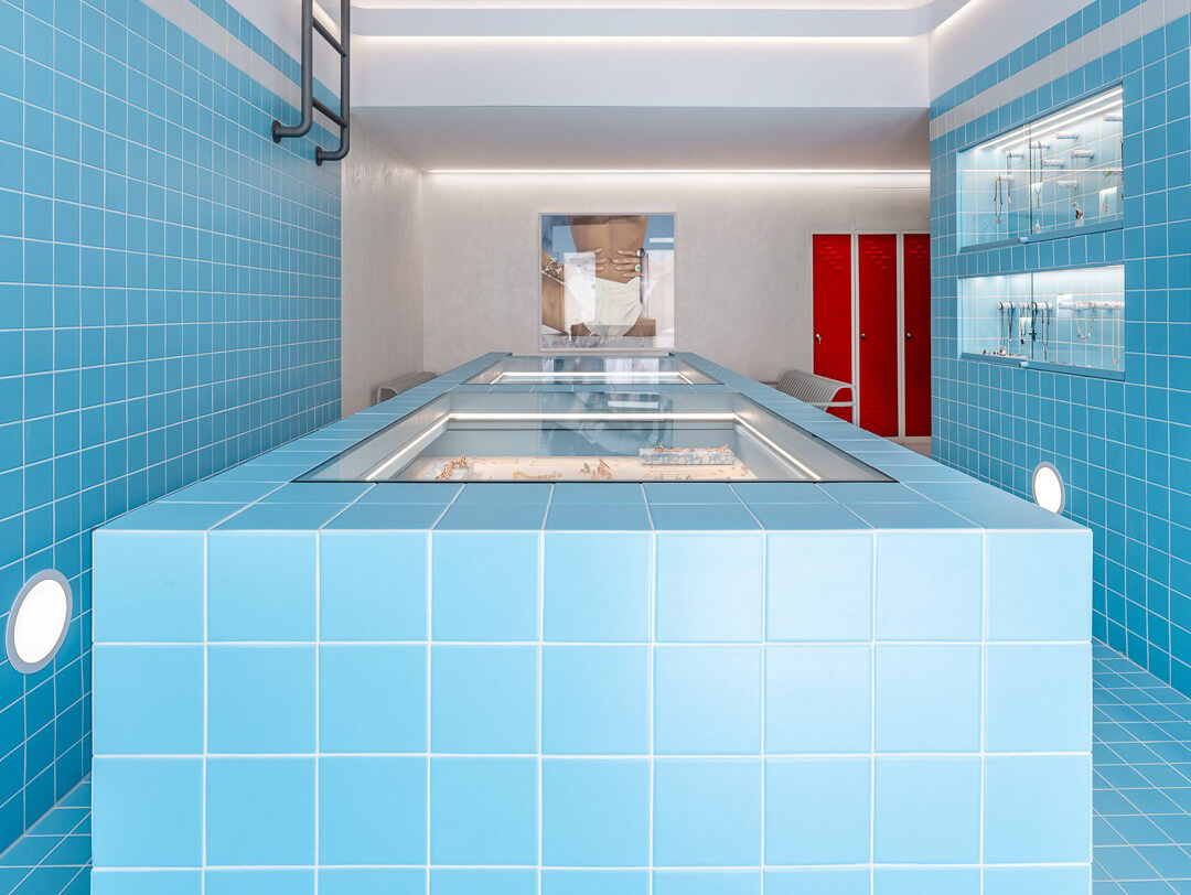 C'est certainement la boutique la plus curieuse que vous trouverez à Mykonos ! Gavello est une marque de bijoux. À Mykonos elle a transformé son magasin en piscine des années 60. C'est l'agence Saint of Athens qui en est à l'origine. Carreaux bleu clair, casiers, porte-serviette et bancs sont des détails permettant de mettre en valeur les créations originales de la marque.