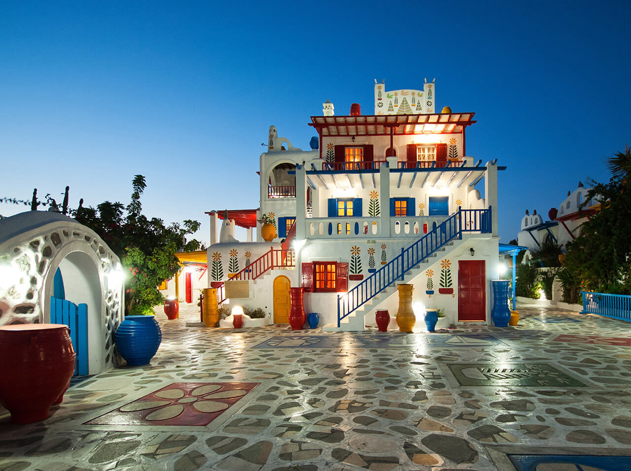 Vous cherchez un hébergement insolite à Mykonos où séjourner ? Sun of Mykonos Studios propose des studios fonctionnels dans un environnement extérieur qui sort de l'ordinaire ! Vous découvrirez en effet une piscine avec une grande fleur dessinée dans le fond et une façade colorée pleine de joie !