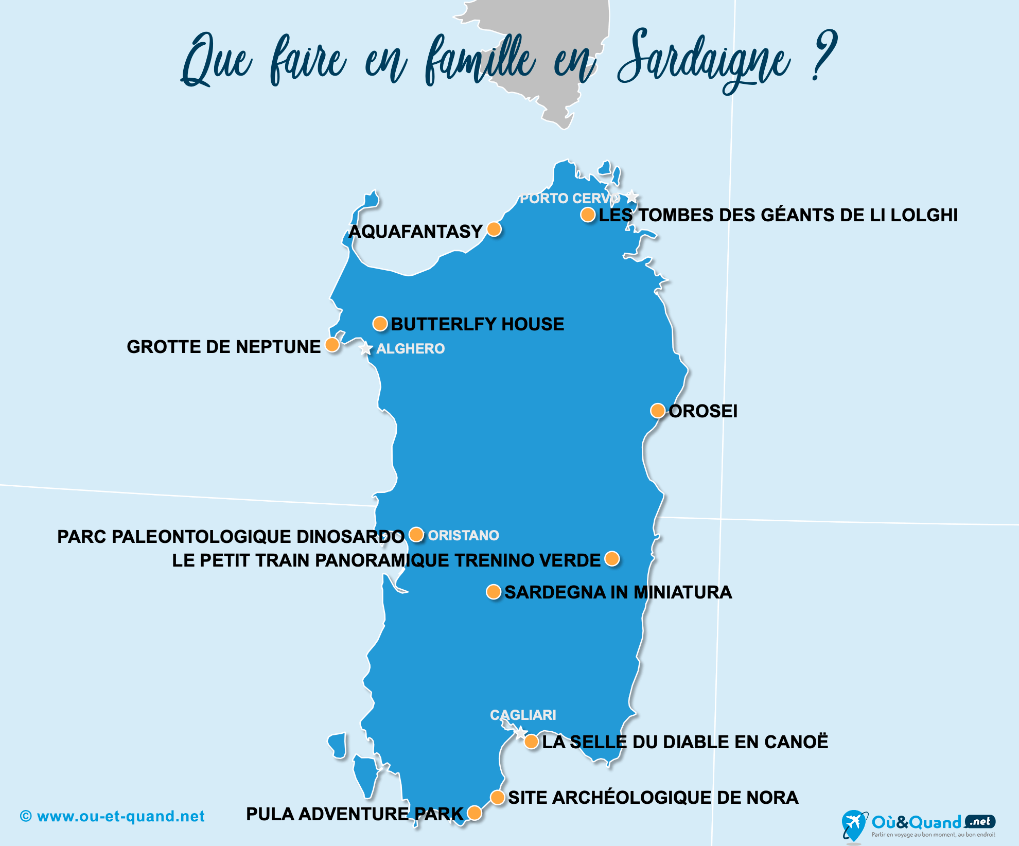 Pour y voir plus clair dans nos recommandations de régions et de villes en Sardaigne où aller en famille, les voici réunies sur une carte de la Sardaigne :