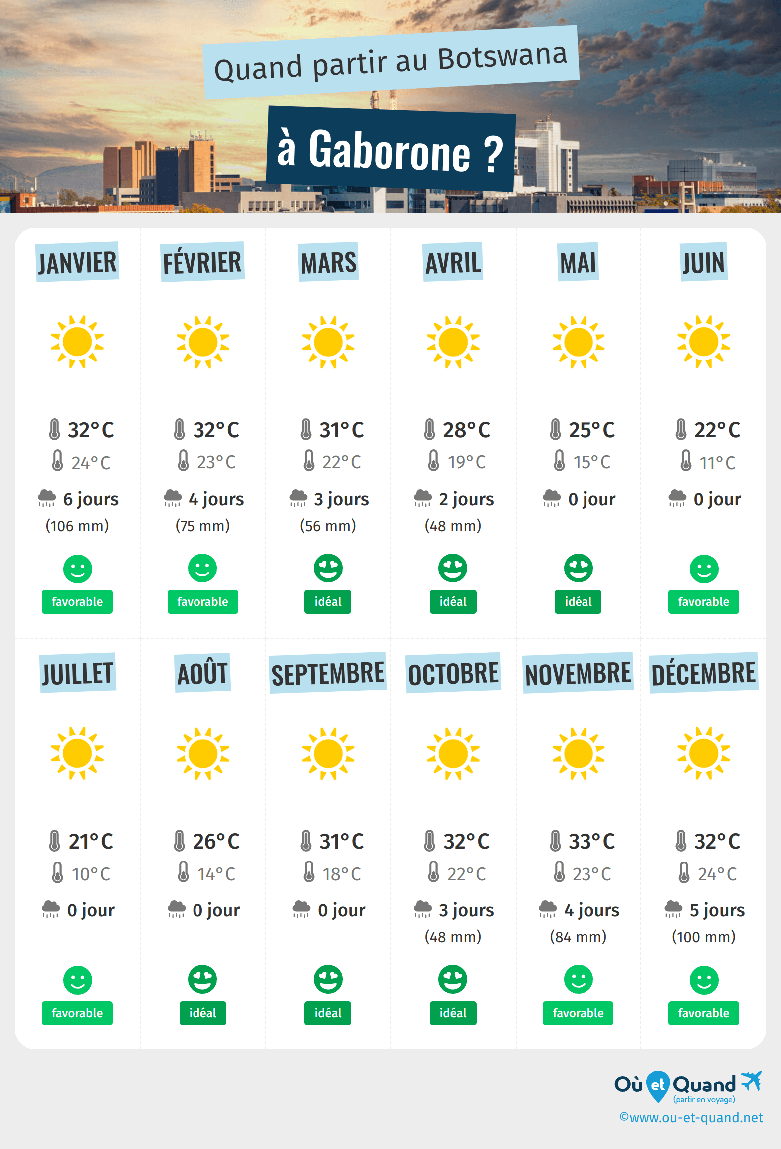 Pour obtenir toutes les informations sur le climat et la météo à Gaborone d'un mois précis, cliquez sur le lien correspondant ci-dessous :