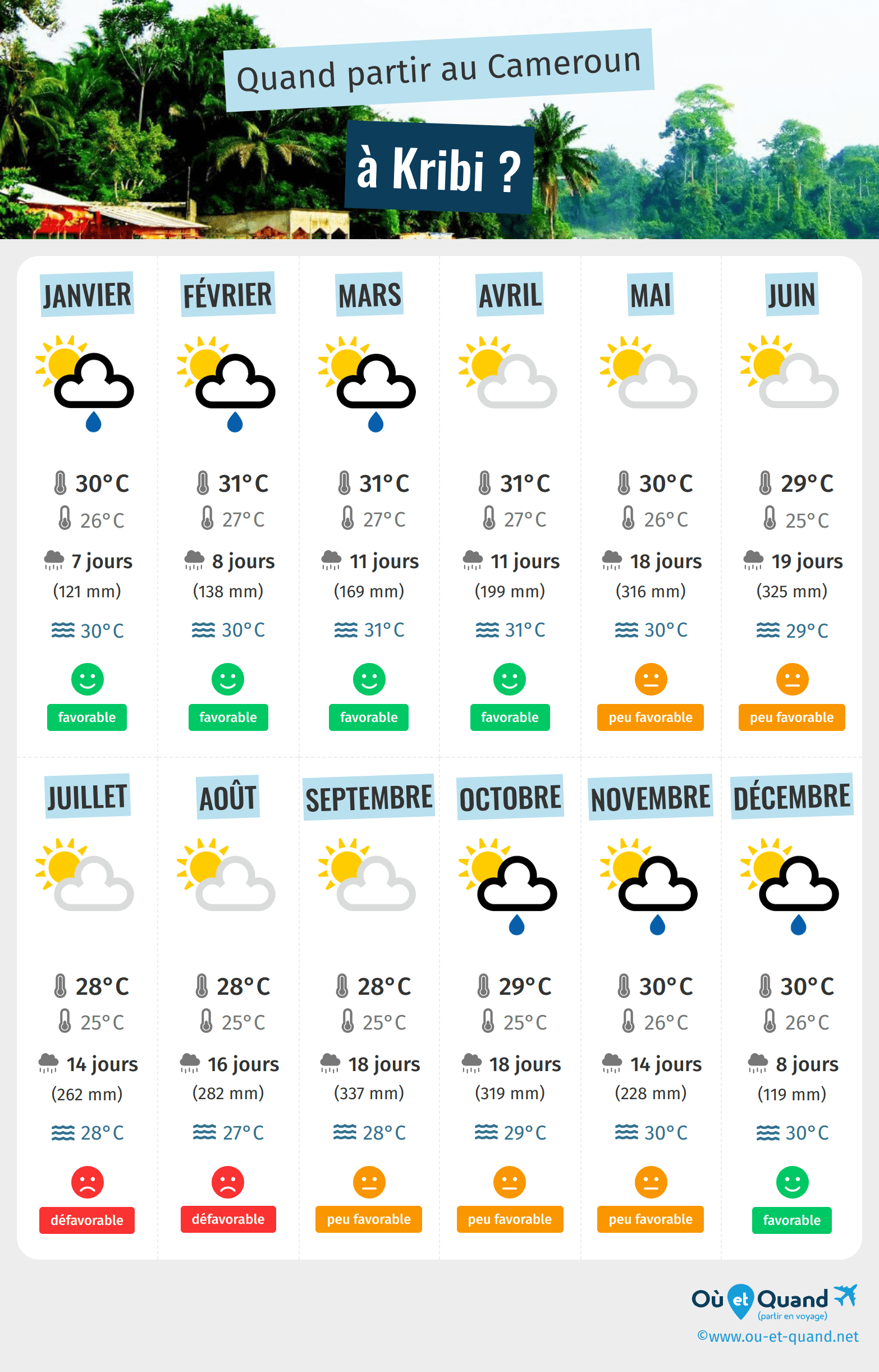 La température maximale à Kribi est en moyenne de 30°C sur l'année (de 28°C en août à 31°C en mars). Il pleut 2810mm sur l'année, avec un minimum de 119mm en décembre et un maximum de 337mm en septembre. Le climat est correct pour partir en voyage à Kribi de Janvier à Juin et de Septembre à Décembre, mais la météo est vraiment agréable de Janvier à Avril et en Décembre. Pour se baigner, la meilleure période pour une température de l'eau convenable est de Janvier à Juillet et de Septembre à Décembre.