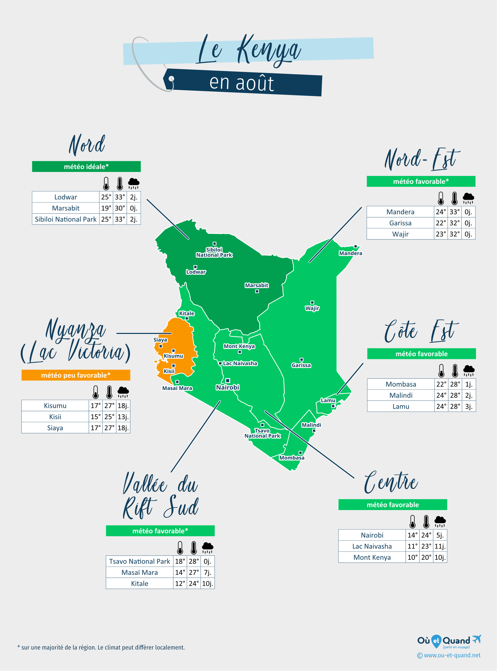 Selon les localités et le relief environnant, le climat en août au Kenya peut être agréable ou à peine convenable. En fait, certaines zones, comme celles où se trouvent Kisumu et Eldoret, sont pluvieuses, comparées au reste du territoire ; les matinées et les nuits peuvent être très douces. Par contre, du côté de Nairobi, les conditions climatiques permettent encore de profiter du soleil avec une sensation de confort, et ce, malgré la douceur des températures matinales.