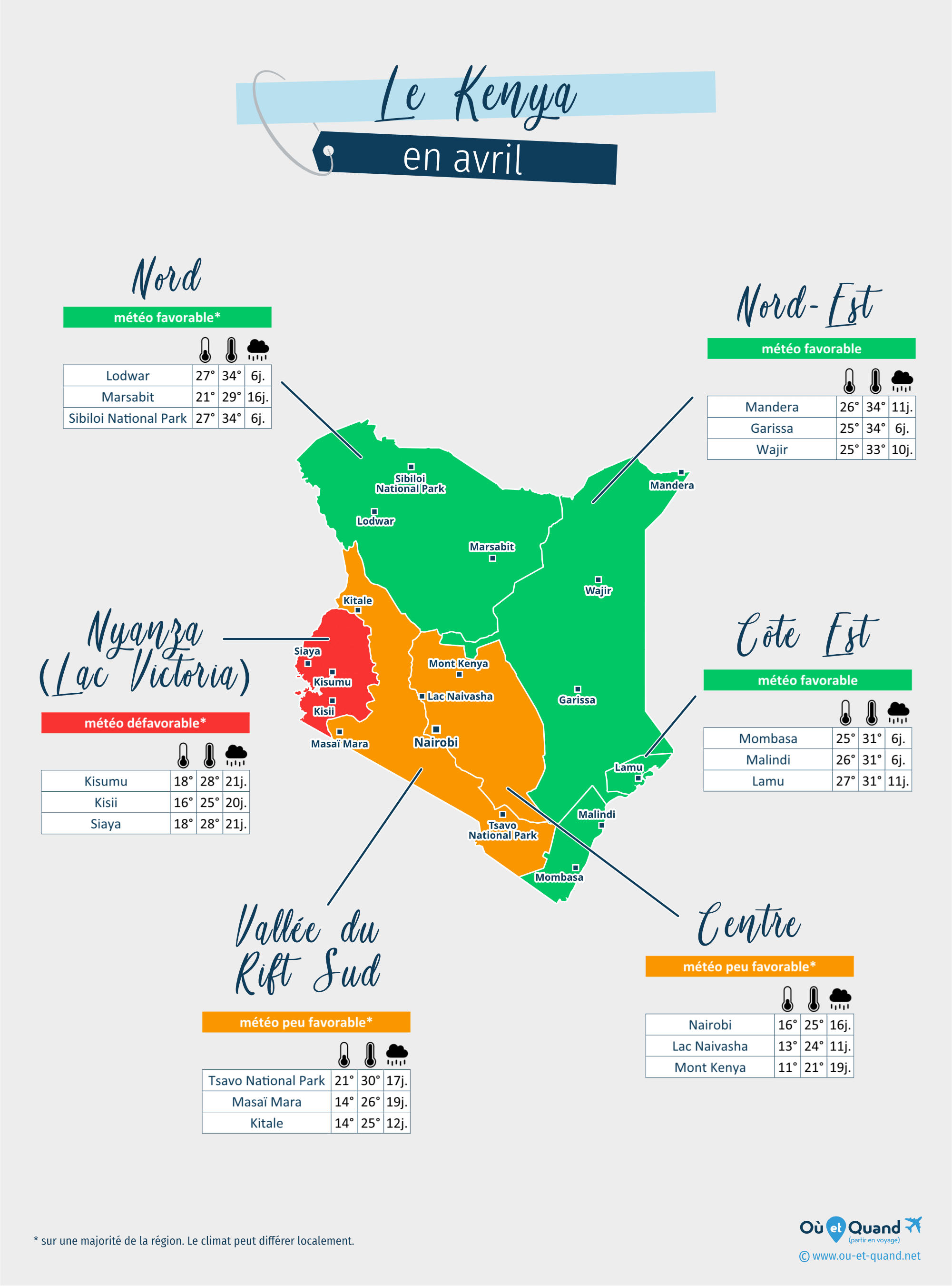 Découvrez sur la carte ci-dessous où aller au Kenya pour visiter cette destination au mois d'avril avec les meilleures conditions climatiques.