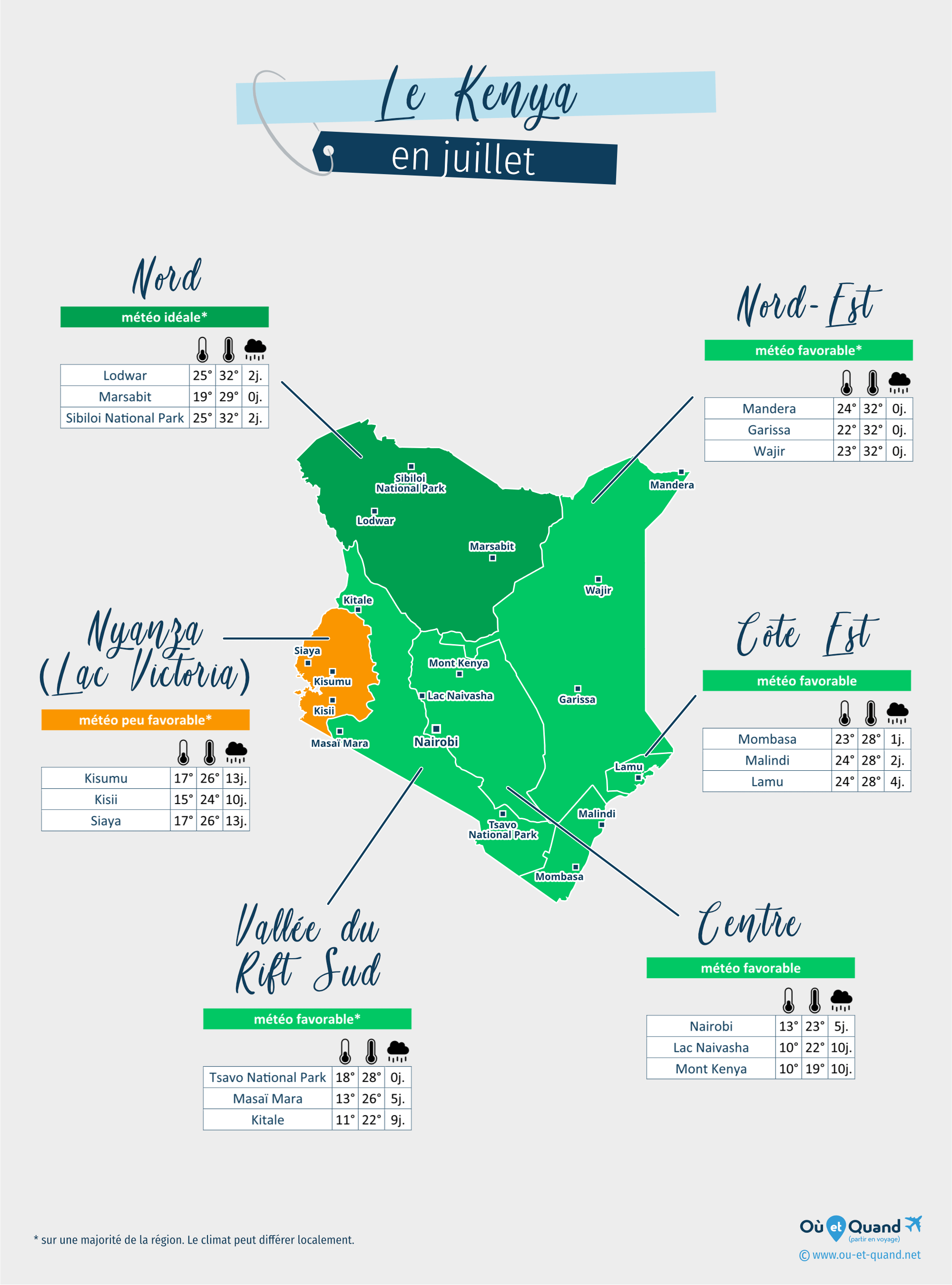 Découvrez sur la carte ci-dessous où aller au Kenya pour visiter cette destination au mois de juillet avec les meilleures conditions climatiques.