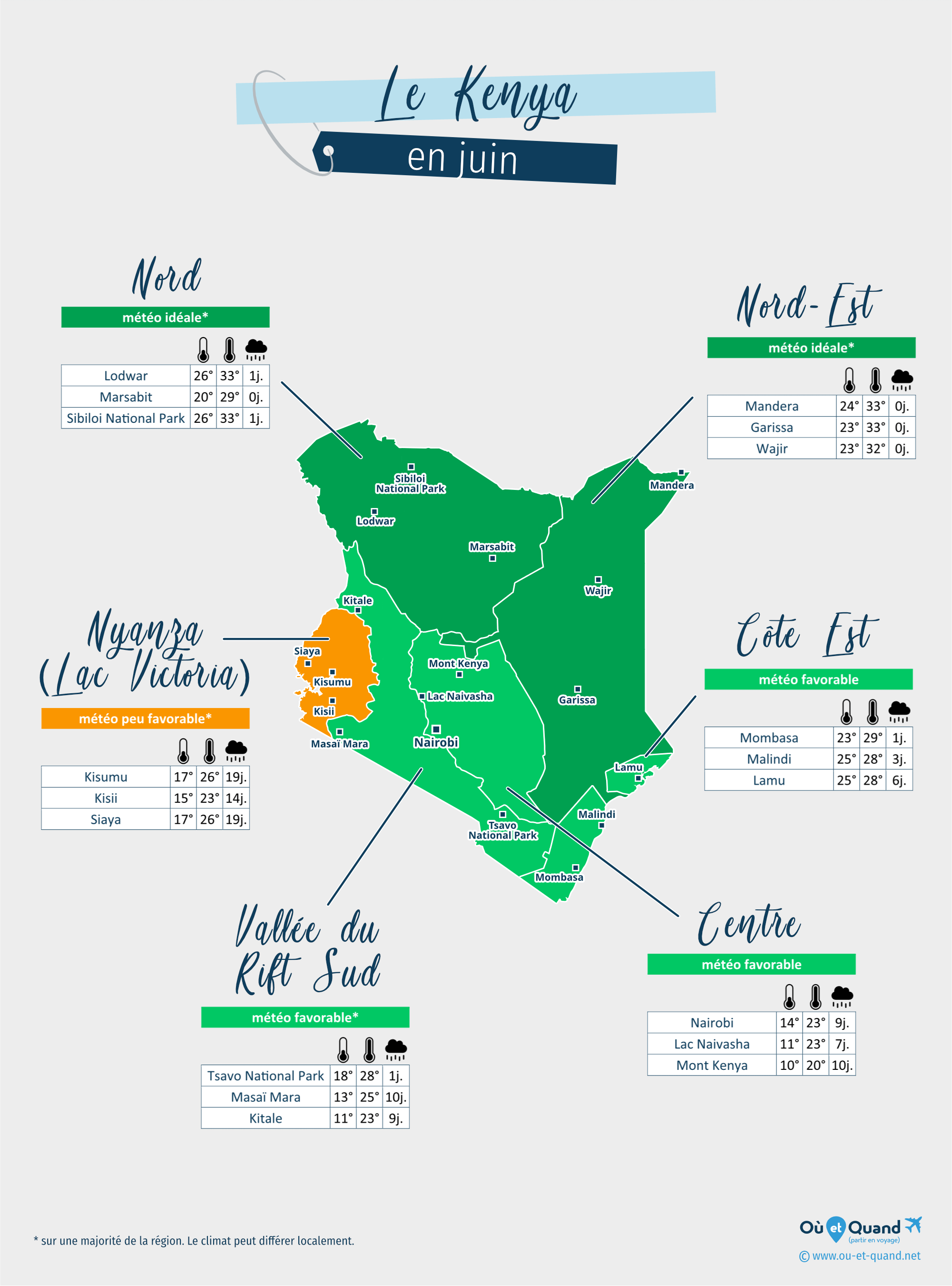 | Centre du Kenya en juin (Nairobi, Lac Naivasha, Mont Kenya...) | 21 à 24°C | 7 à 11 jours | favorable | |