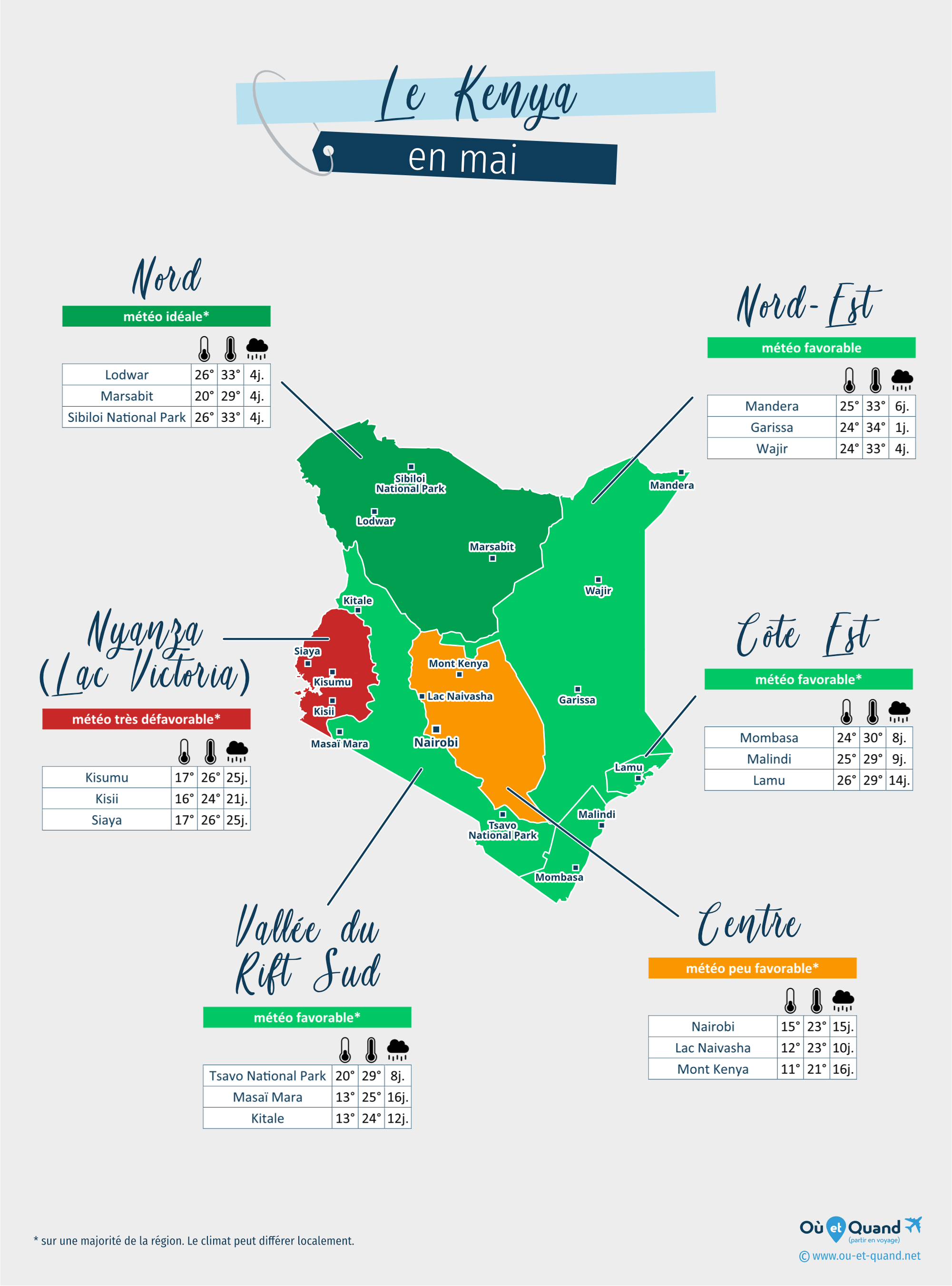 | Centre du Kenya en mai (Nairobi, Lac Naivasha, Mont Kenya...) | 21 à 24°C | 8 à 19 jours | peu favorable* | |