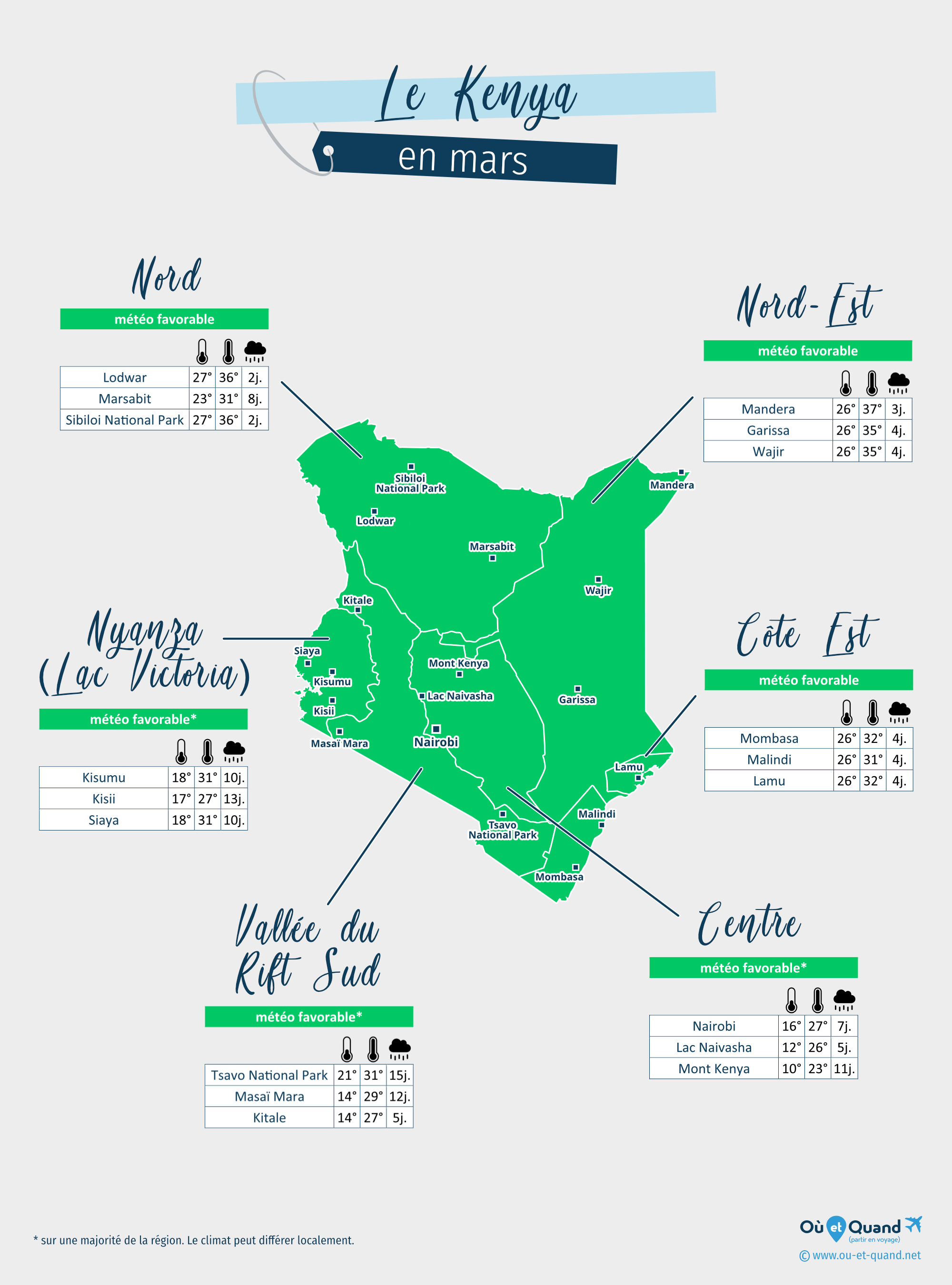 Découvrez sur la carte ci-dessous où aller au Kenya pour visiter cette destination au mois de mars avec les meilleures conditions climatiques.