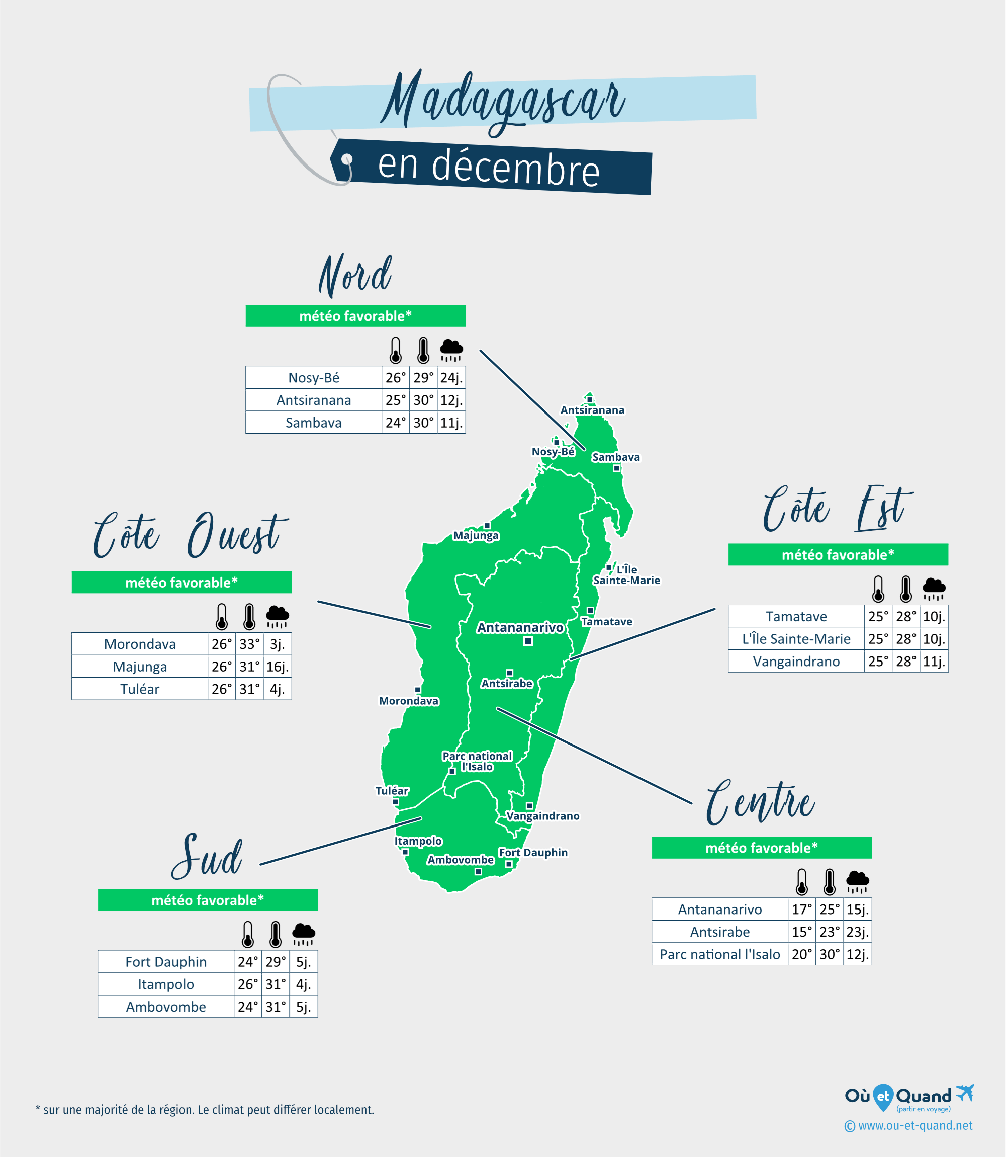 Utilisez les onglets ci-dessous pour découvrir la météo en décembre dans chaque zone de Madagascar et consulter les normales saisonnières des principales villes.