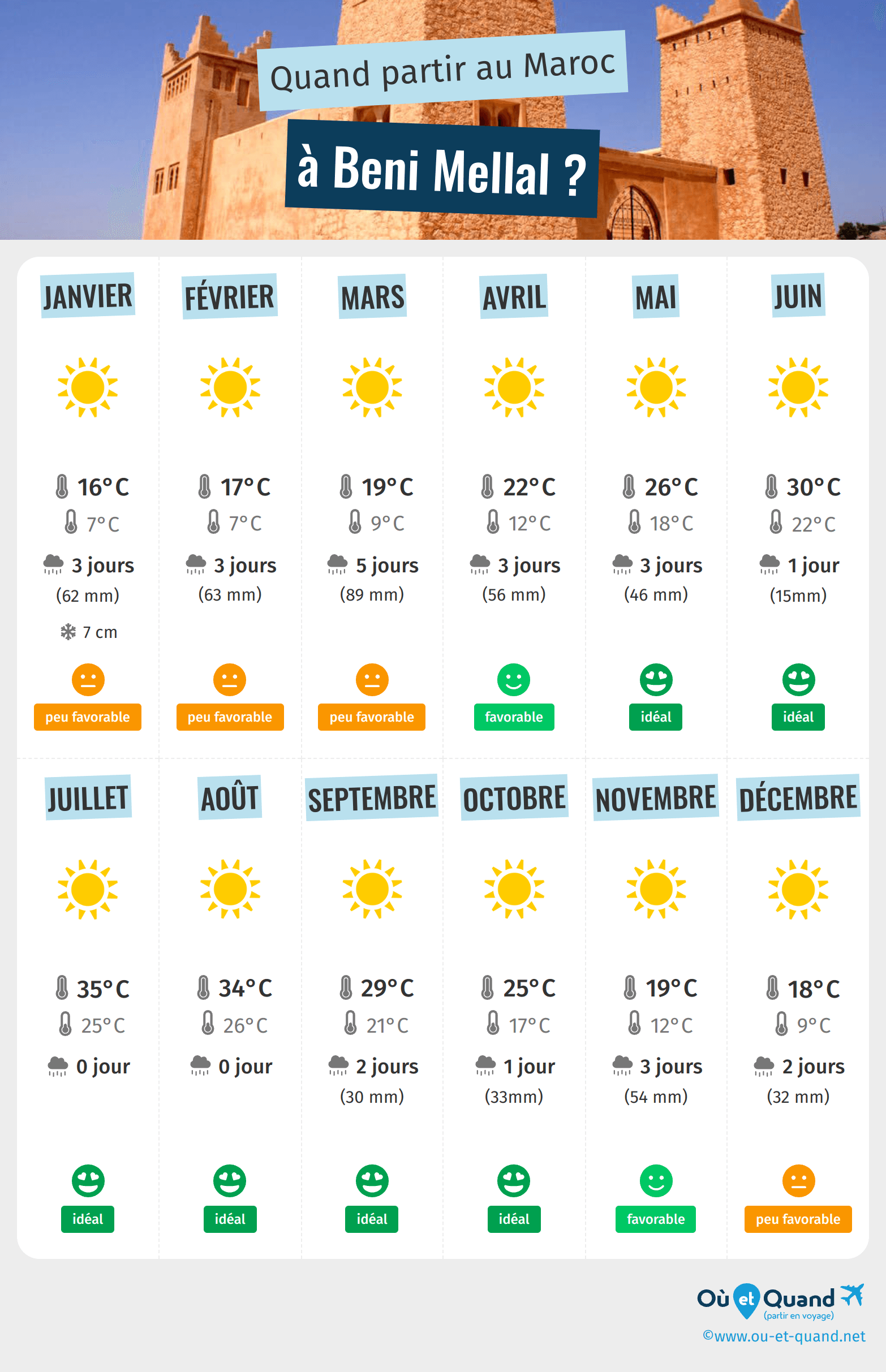 Pour obtenir toutes les informations sur le climat et la météo à Beni Mellal d'un mois précis, cliquez sur le lien correspondant ci-dessous :