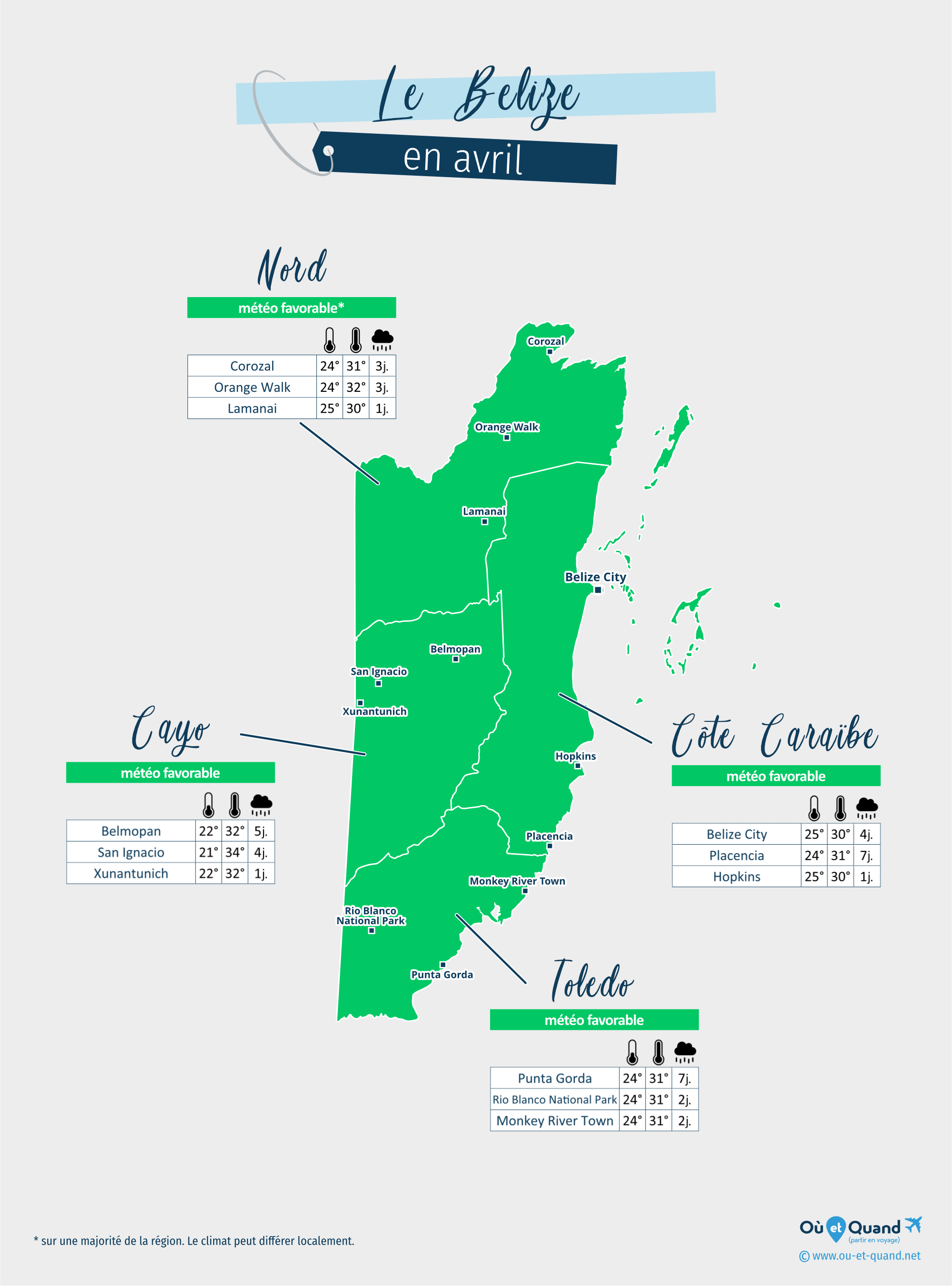 | Côte Caraïbe du Belize en avril (Belize City, Placencia, Hopkins...) | 31 à 33°C | 1 à 7 jours | 28°C | favorable |