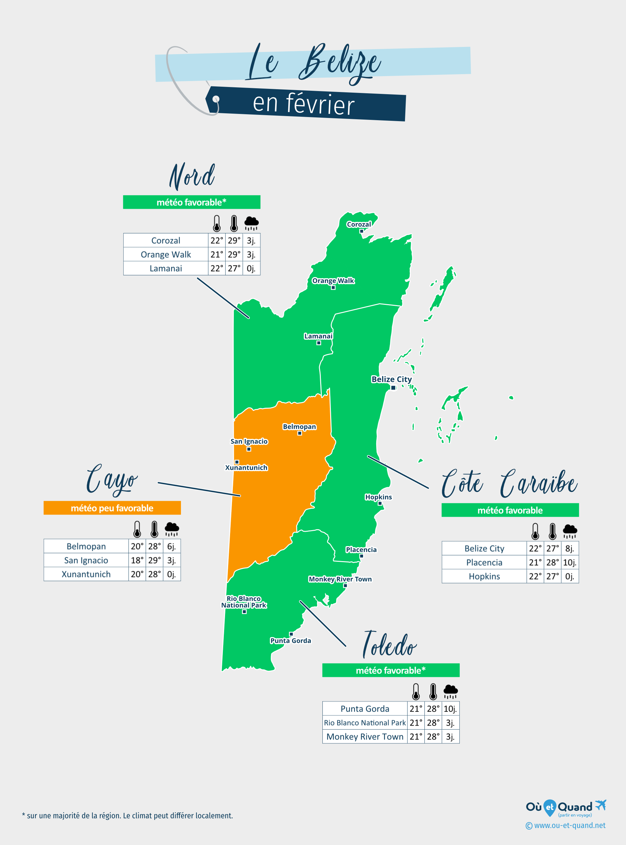 Découvrez sur la carte ci-dessous où aller au Belize pour visiter cette destination au mois de février avec les meilleures conditions climatiques.