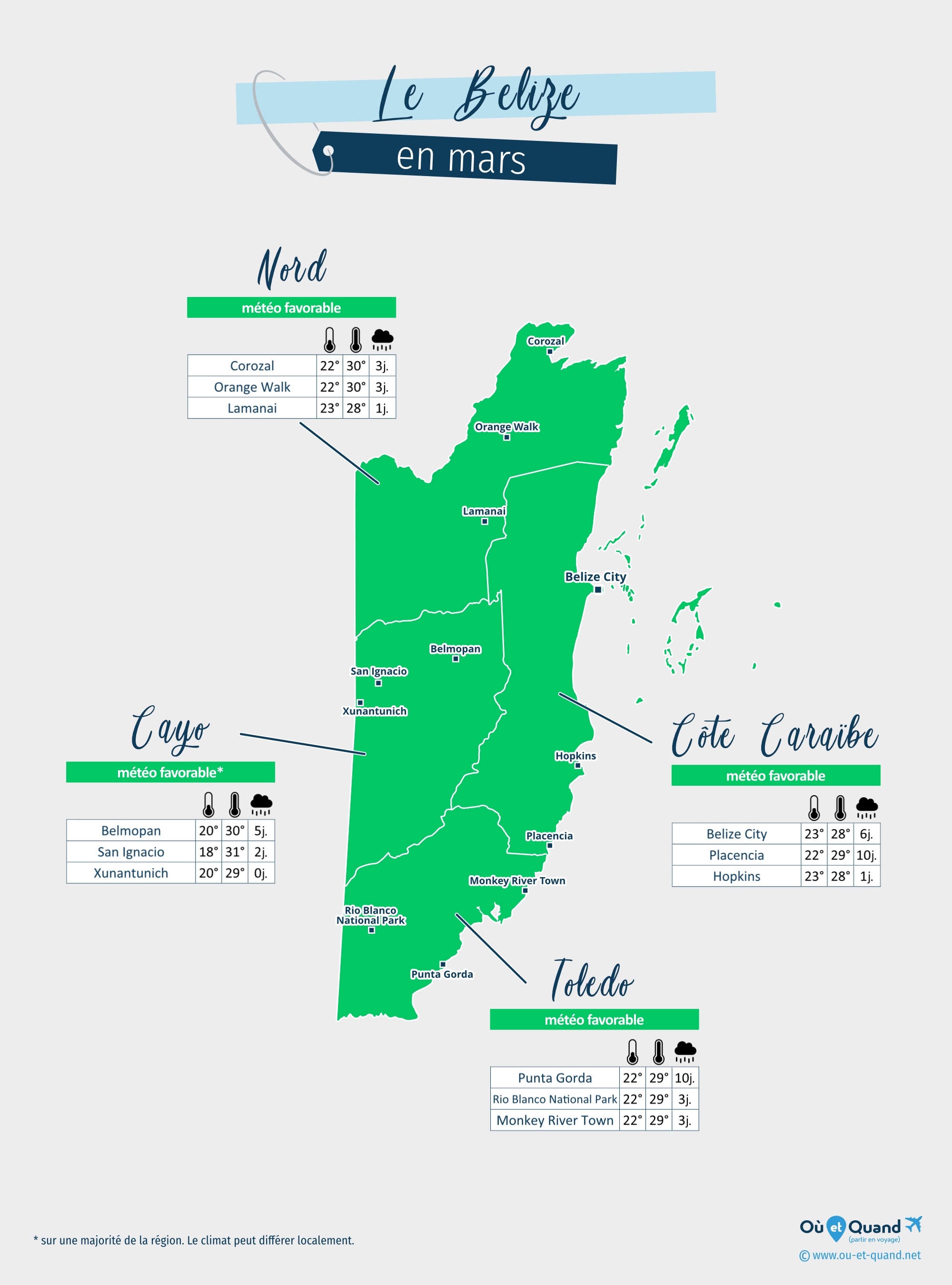 | Toledo en mars (Punta Gorda, Rio Blanco National Park, Monkey River Town...) | 28 à 30°C | 3 à 10 jours | 28°C | favorable |