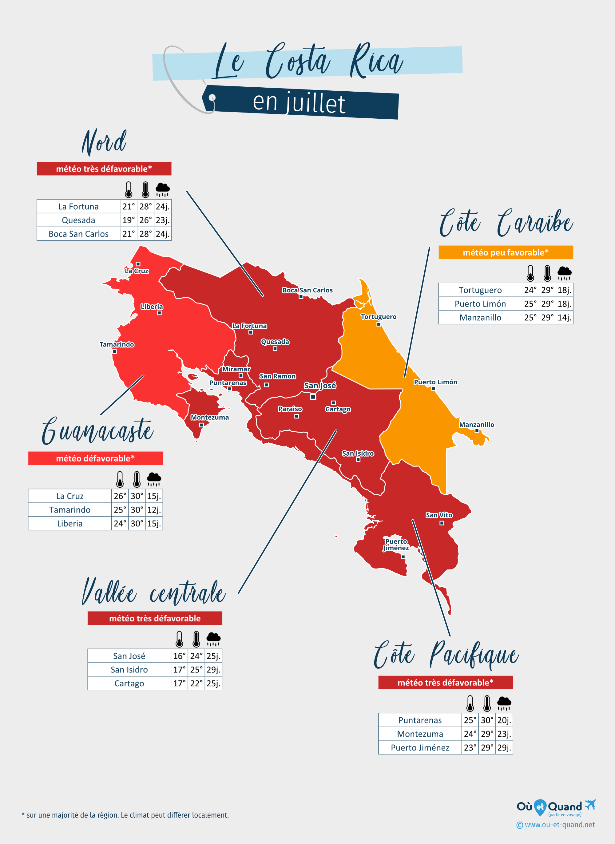 | Nord du Costa Rica en juillet (La Fortuna, Quesada, Boca San Carlos...) | 24 à 31°C | 15 à 26 jours | très défavorable* |